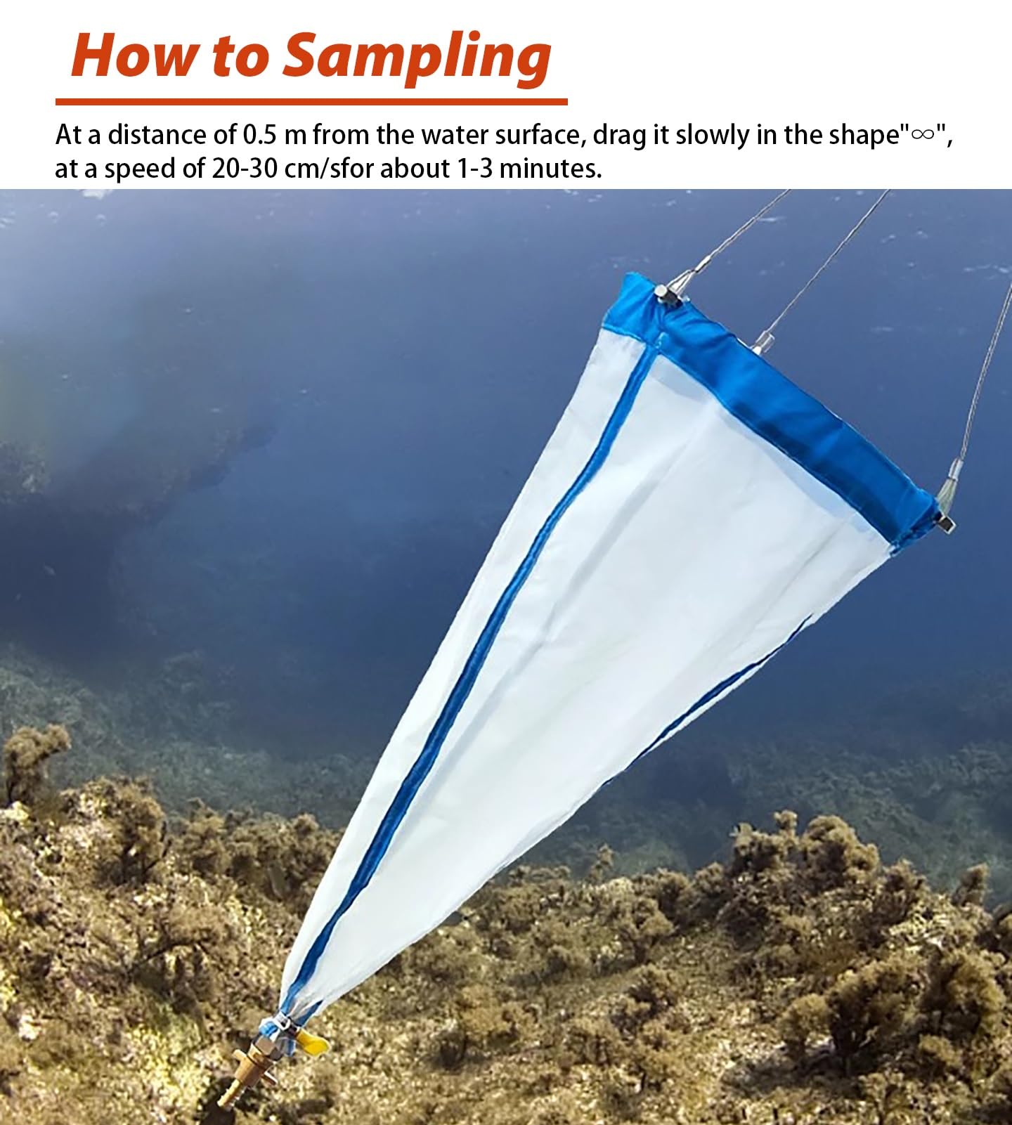 【 How to Sampling 】 : In the water depth from the surface to 0.5m, do the "∞" shape reciprocating slow drag at a speed of 20-30 cm/s for about 1-3 minutes, after sampling, clean and dry the plankton net for later use