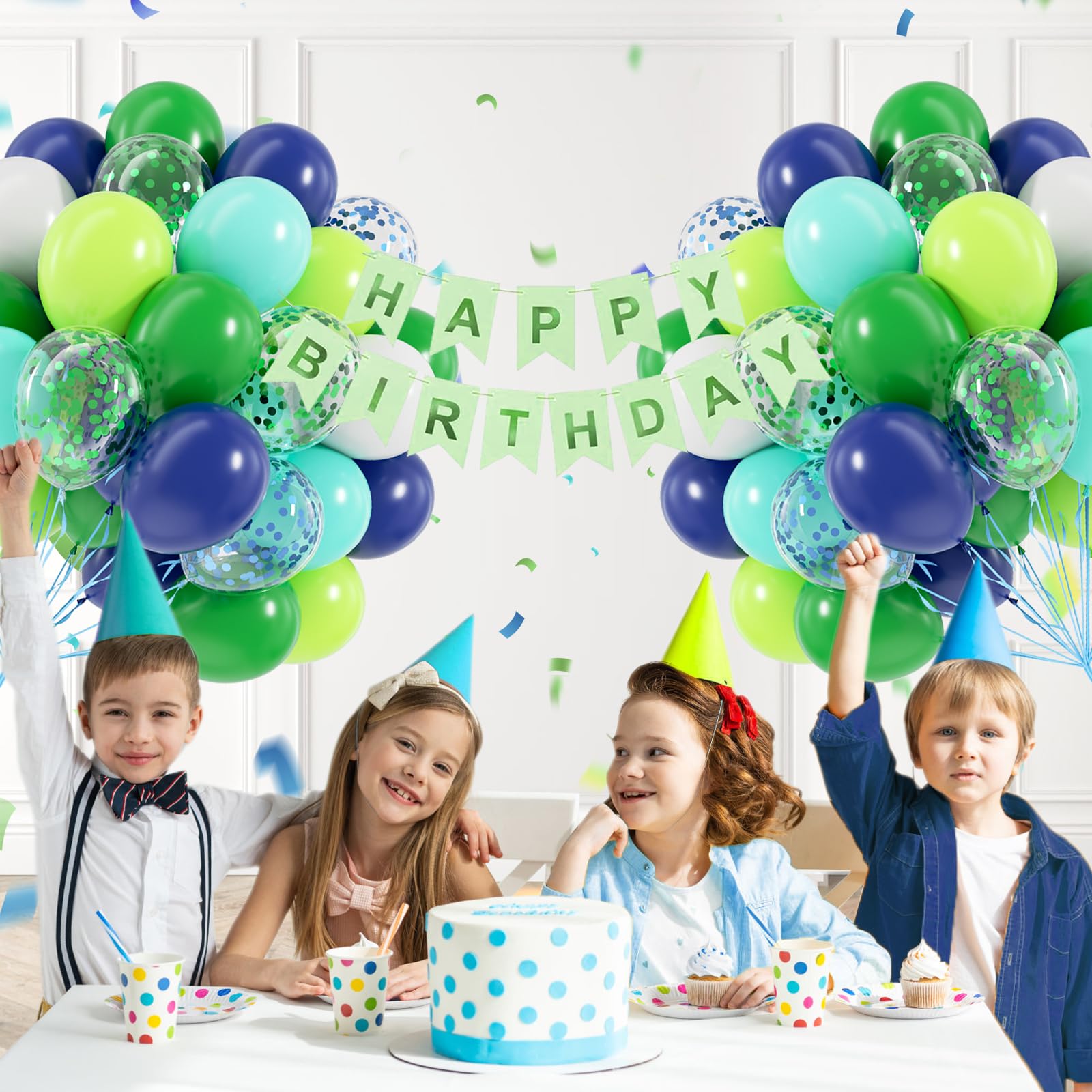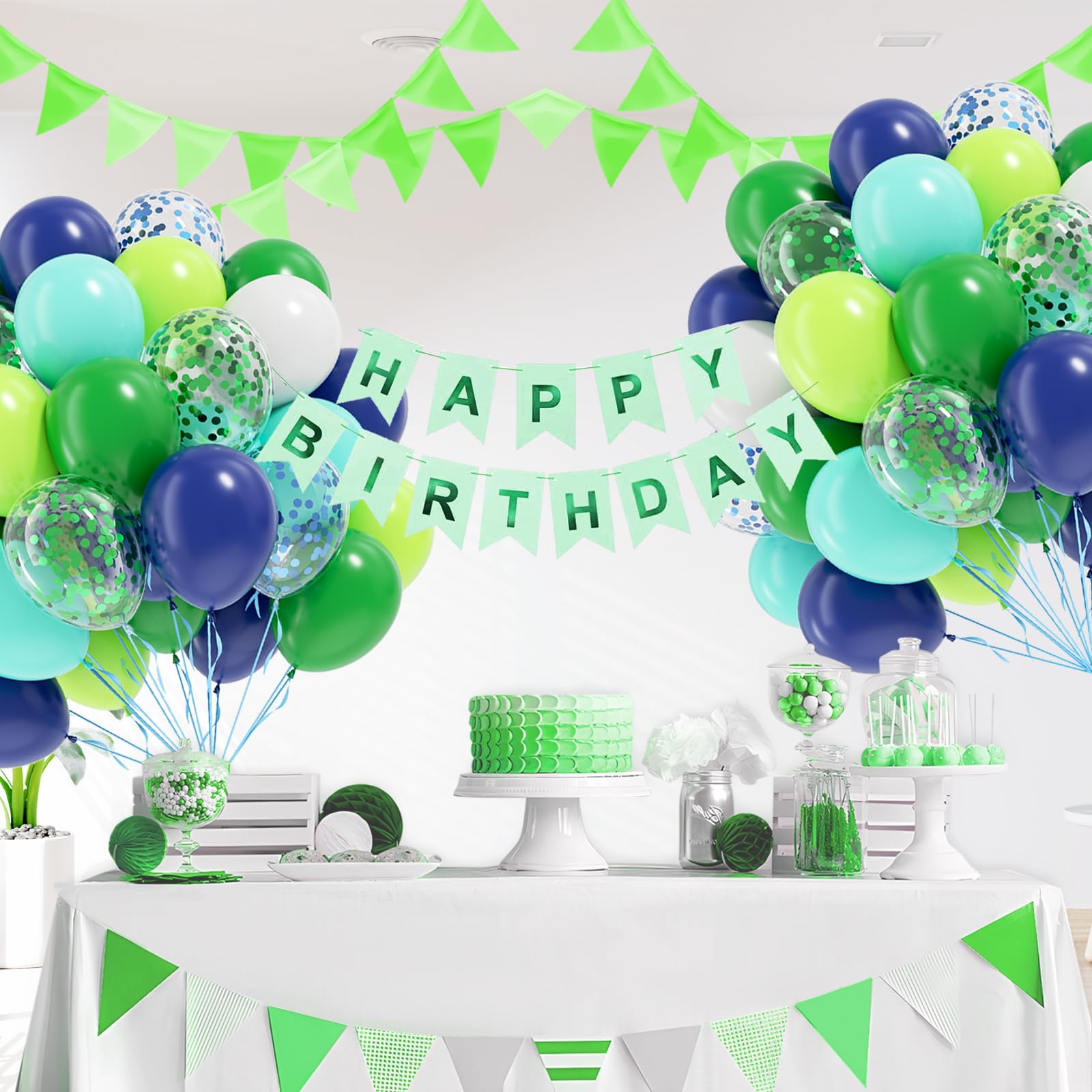 What You Will Get: The package includes 60pcs 12inch navy blue balloonsx10, 12inch green balloonsx10, 12inch white balloonsx10, 12inch lime green balloonsx10, 12inch teal balloonsx10, 12inch green confetti balloonsx5, 12inch blue confetti balloons x5, glue dotsx20, blue ribbonx1