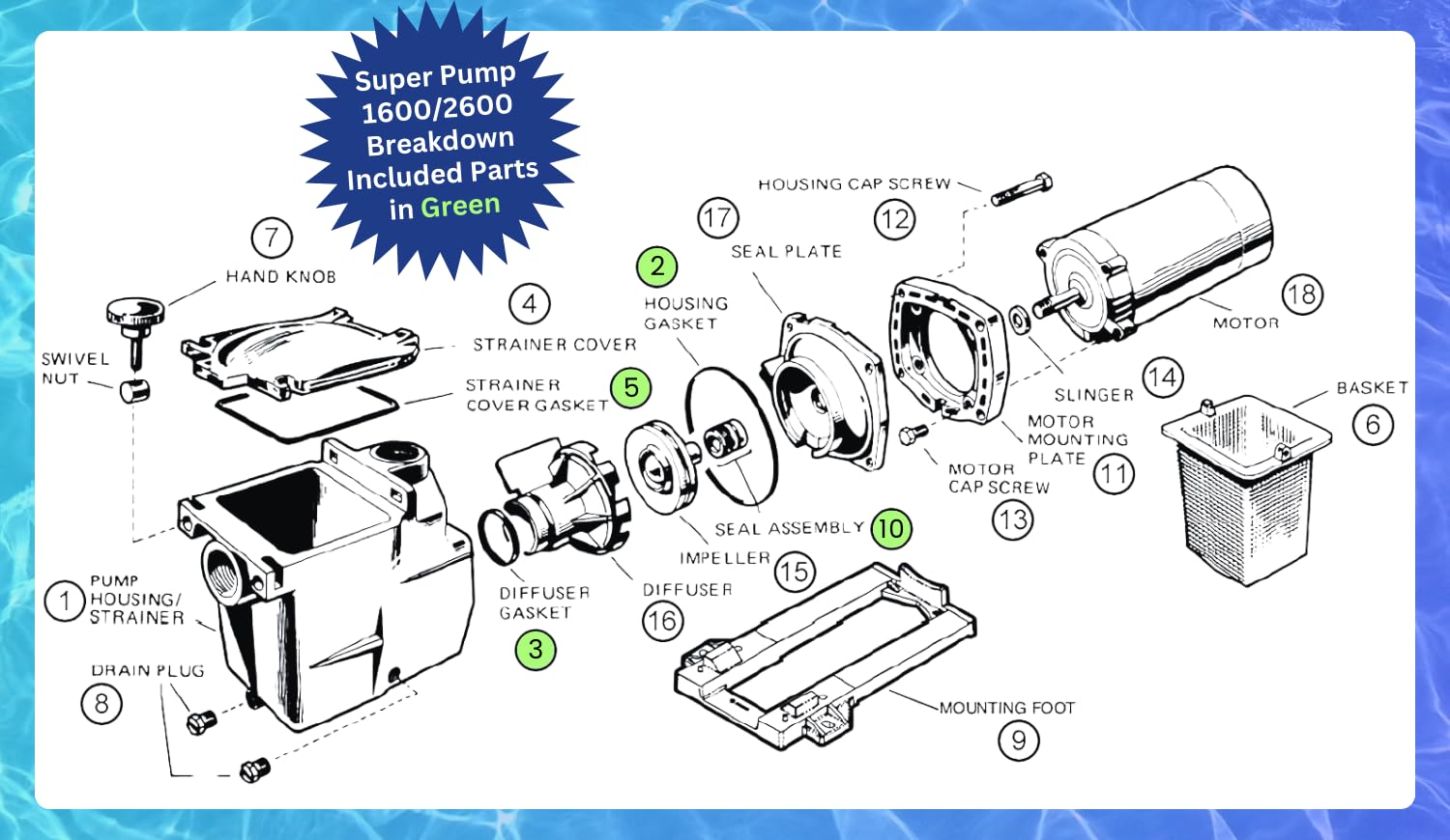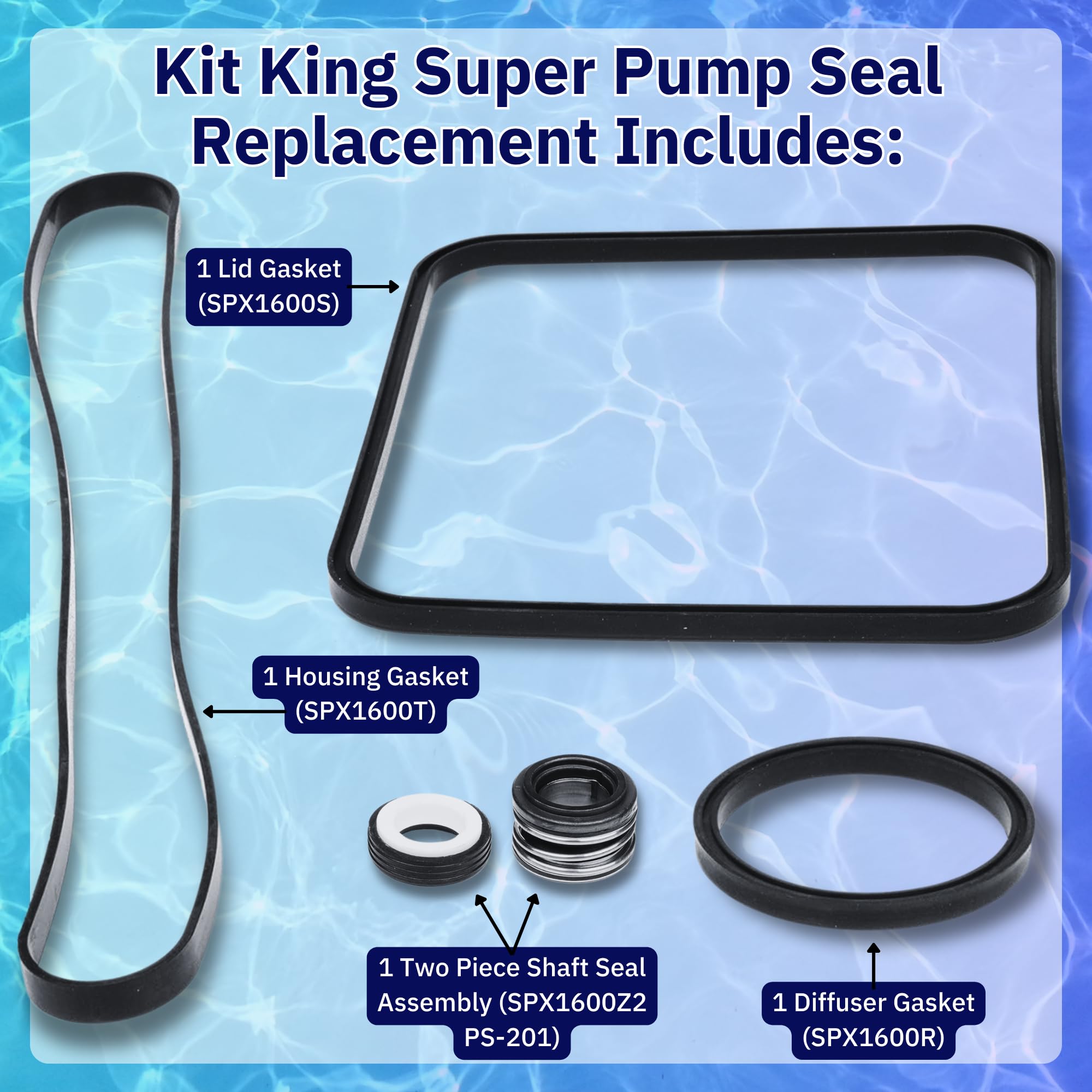 Includes: 1 Diffuser Gasket (SPX1600R), 1 Lid Gasket (SPX1600S), 1 Housing Gasket (SPX1600T), and 1 Two Piece Shaft Seal Assembly (SPX1600Z2 PS-201)