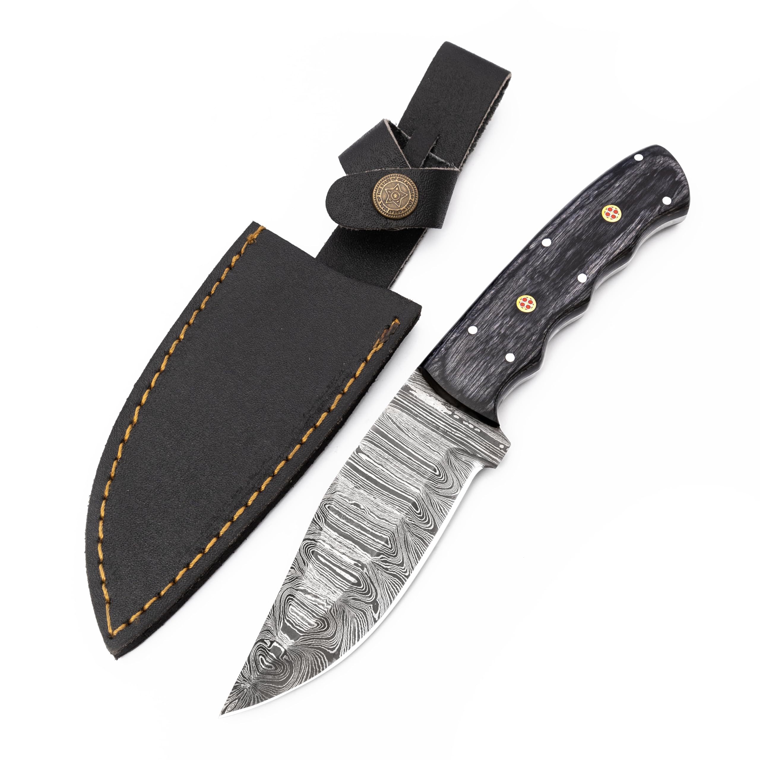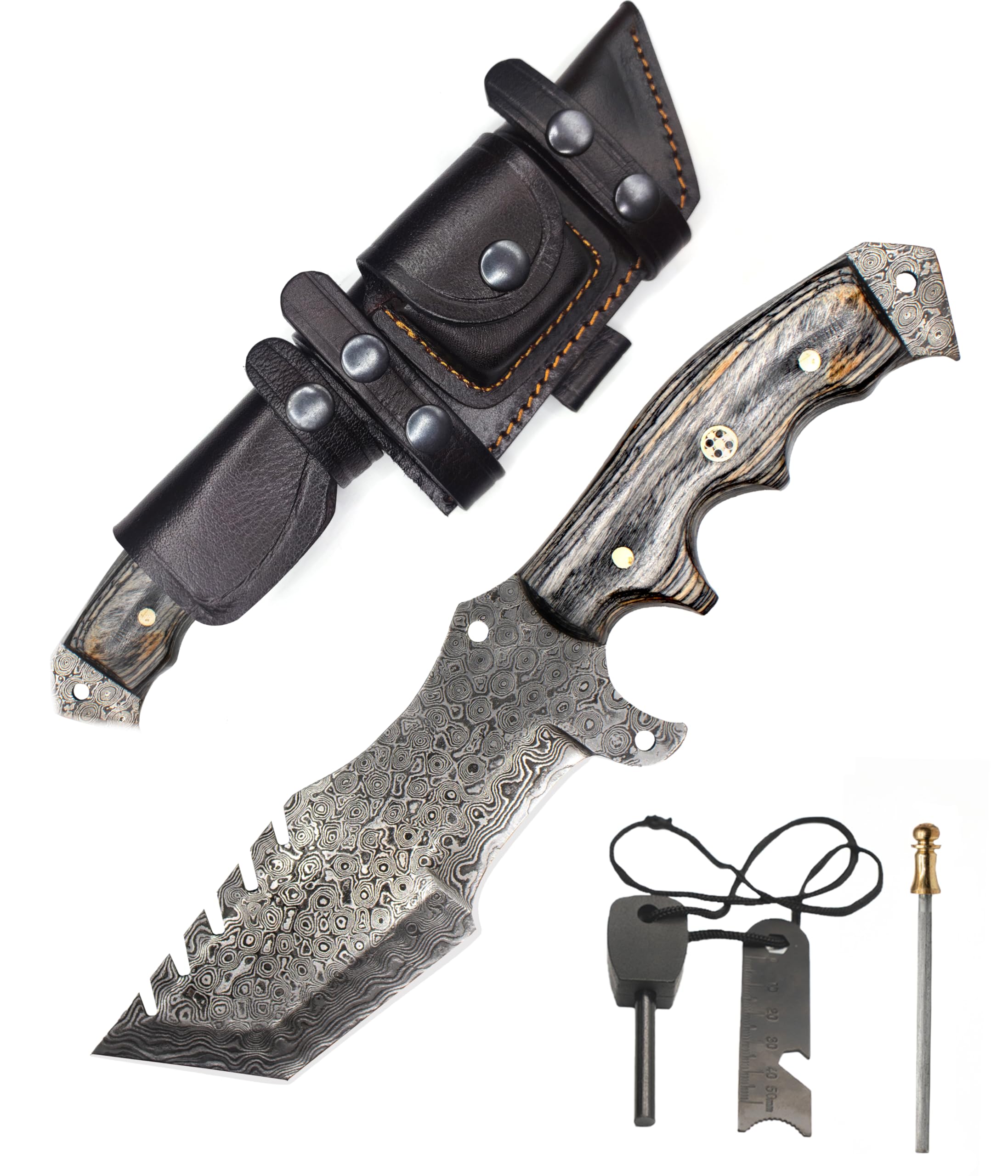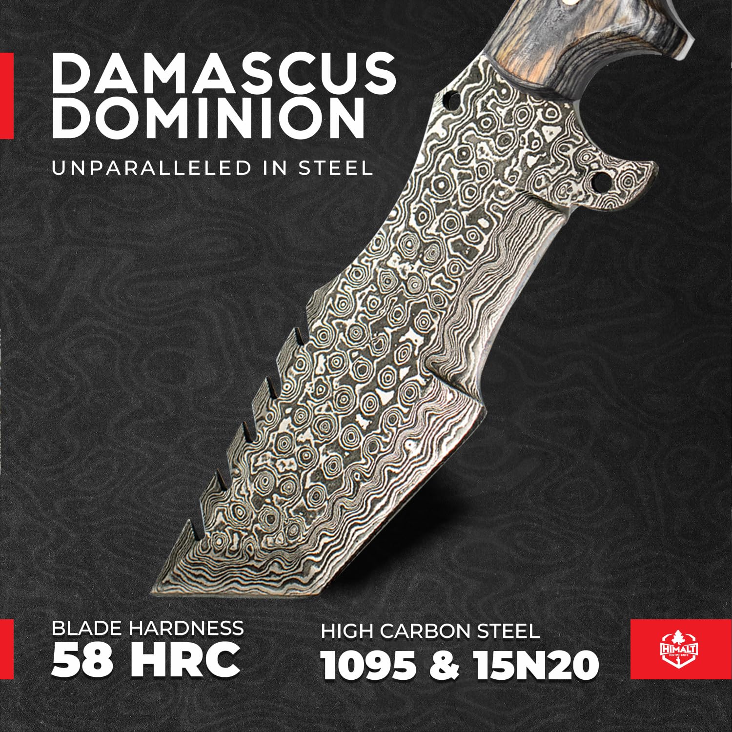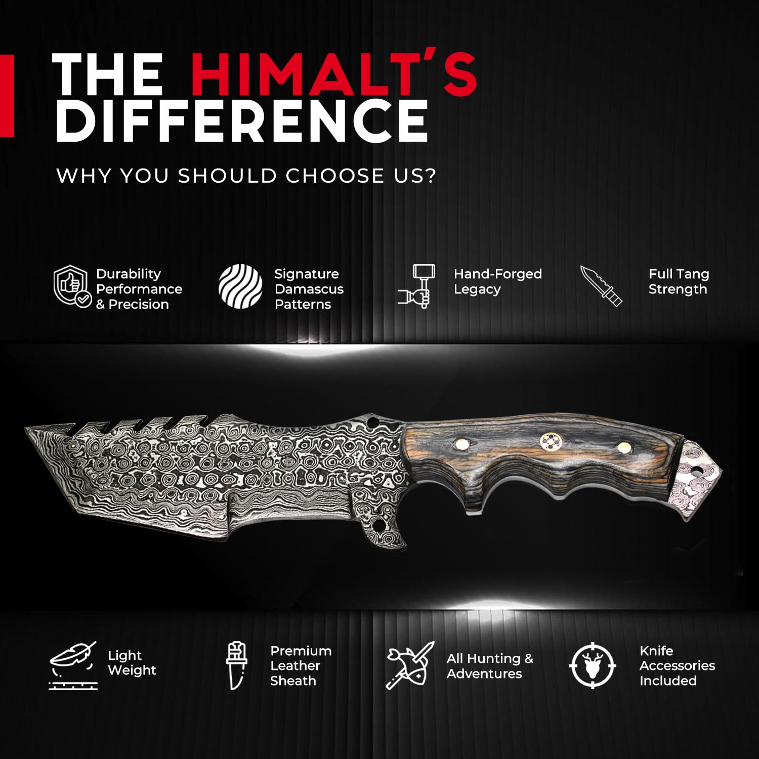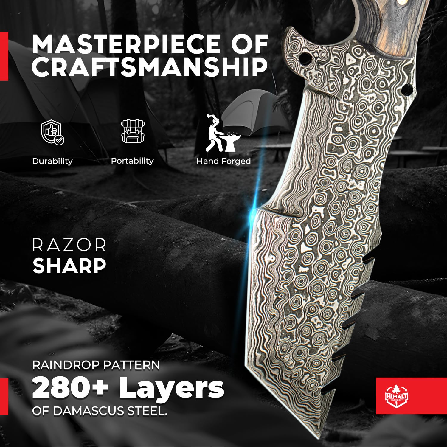 Hand-Forged Hunting Gear: Our hand patented Damascus knife is composed of 1080 and 15N20 high carbon steel, folded 5 times, starting from 9-layers into a raindrop pattern of 288 layers. Boasting a 58-60 HRC hardness rating, the Himalt knife maintains its razor-sharp edge longer, reducing the need for frequent sharpening.