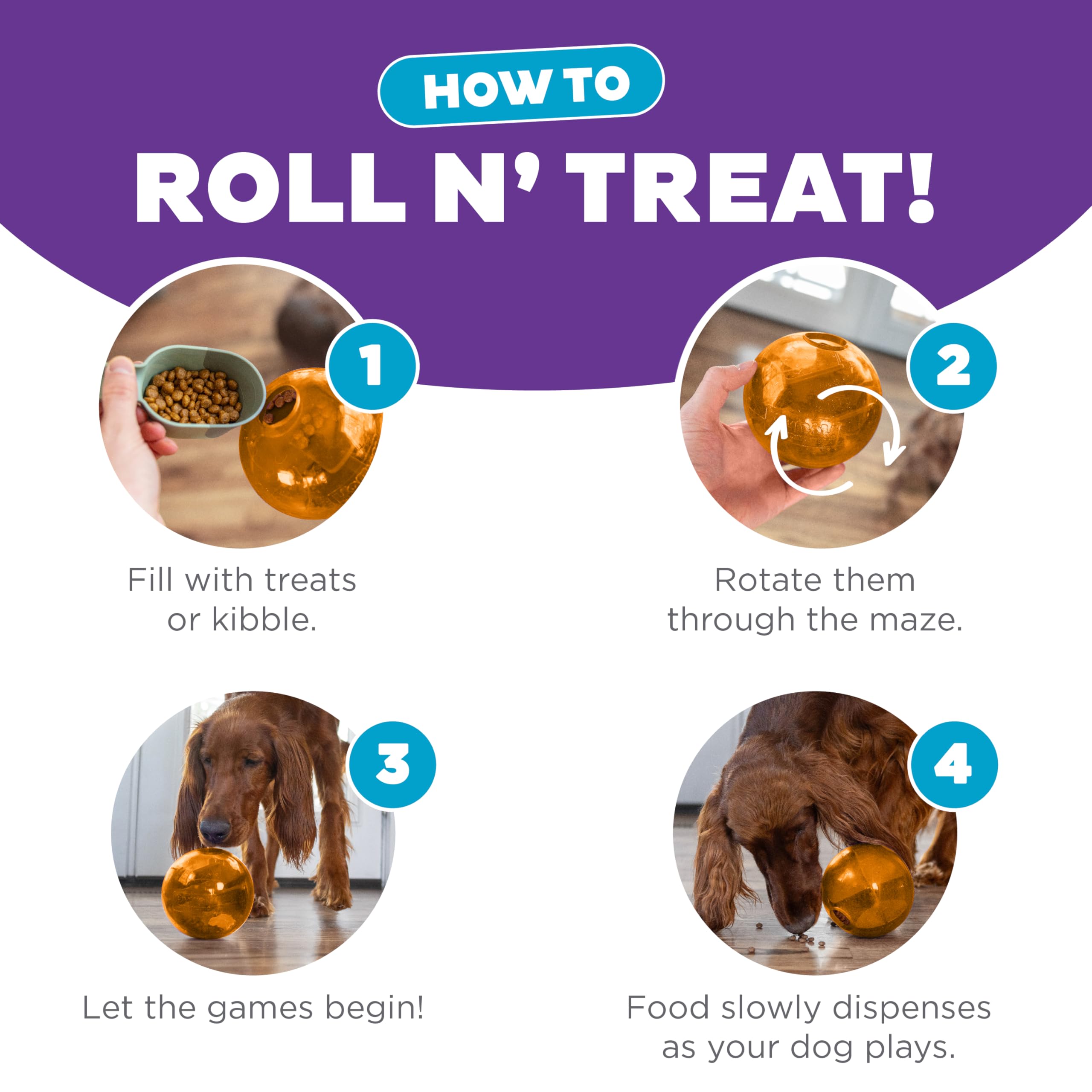 Slow feeder for dogs; great for pups who gobble up their treats too fast, this toy is designed to make it easy to see and sniff out treats while dispensing them at a slower pace that's better for digestion. Note: the size of the treats or kibble determines the flow - smaller pieces release more at once and come out faster.