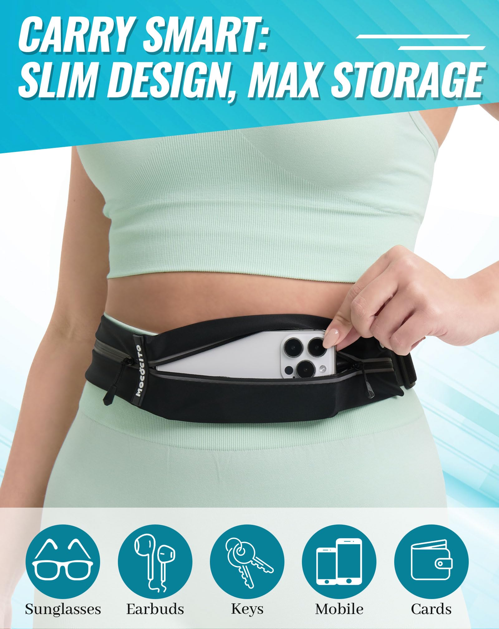 Designed for Runners - Ample space to keep your phone, cash, earphones and small personal items safe and secure while training running, walking, hiking or fitness. The main pocket fits any size phone, and the side smaller pocket is perfect for storing keys, credit card