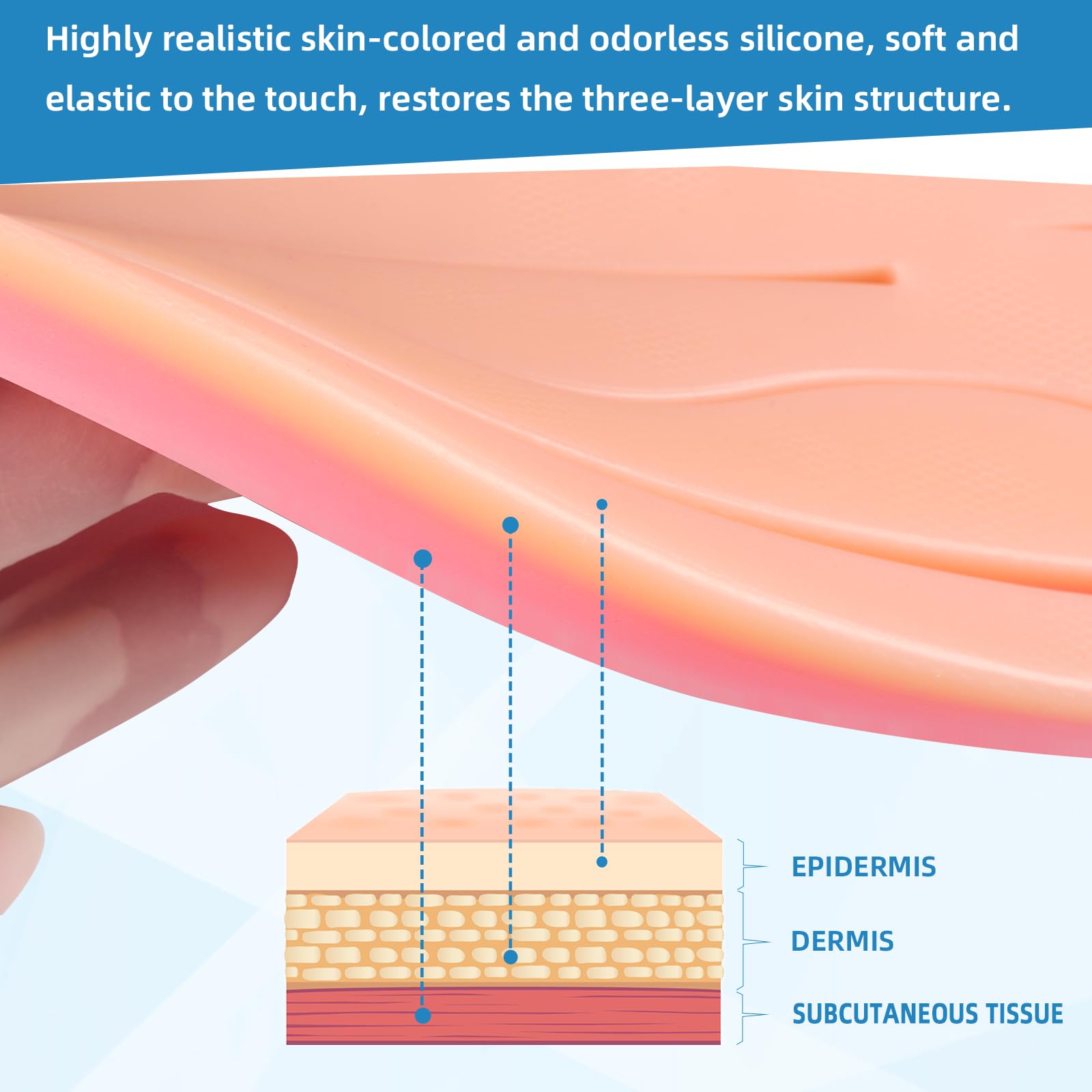 Realistic Suture Practice Experience: Our suture pad is made of high-quality, skin-like, odorless silicone, providing a soft and elastic texture. Simulates the three-layer structure of the human epidermis, dermis and muscle layers, providing a realistic suture practice experience