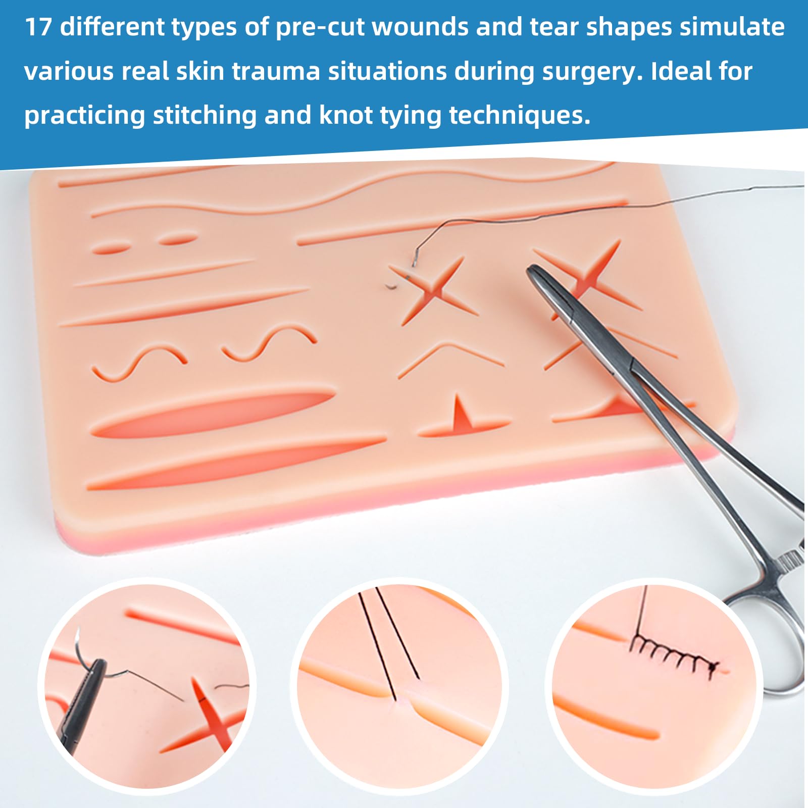Comprehensive Pre-Cut Wounds: The suture pad features 17 different wound shapes, including various incisions and lacerations, to simulate changes in tension in wounds of different sizes and depths. This allows flexibility in adjusting technique and helps students master a variety of suturing skills.