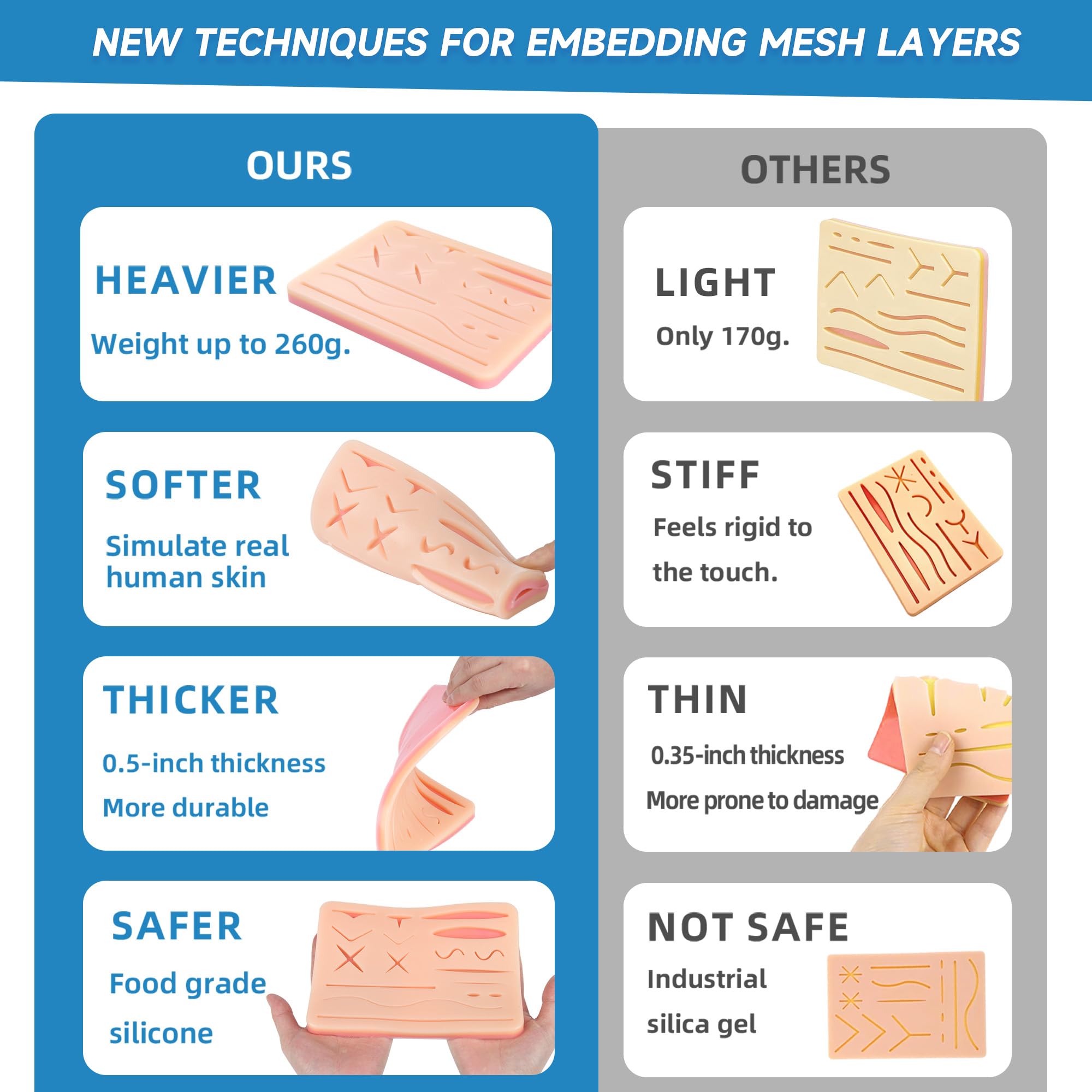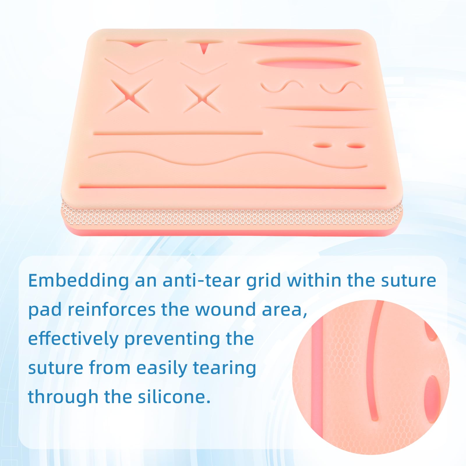 More Durable: With a built-in anti-tear mesh and a weight of 260 grams, the suture pad is highly durable, effectively resisting the tension of suture threads and preventing silicone damage. It ensures a smooth and safe practice experience, making it the best choice for suturing and knot-tying training.