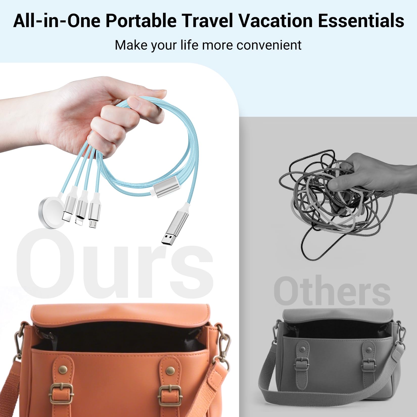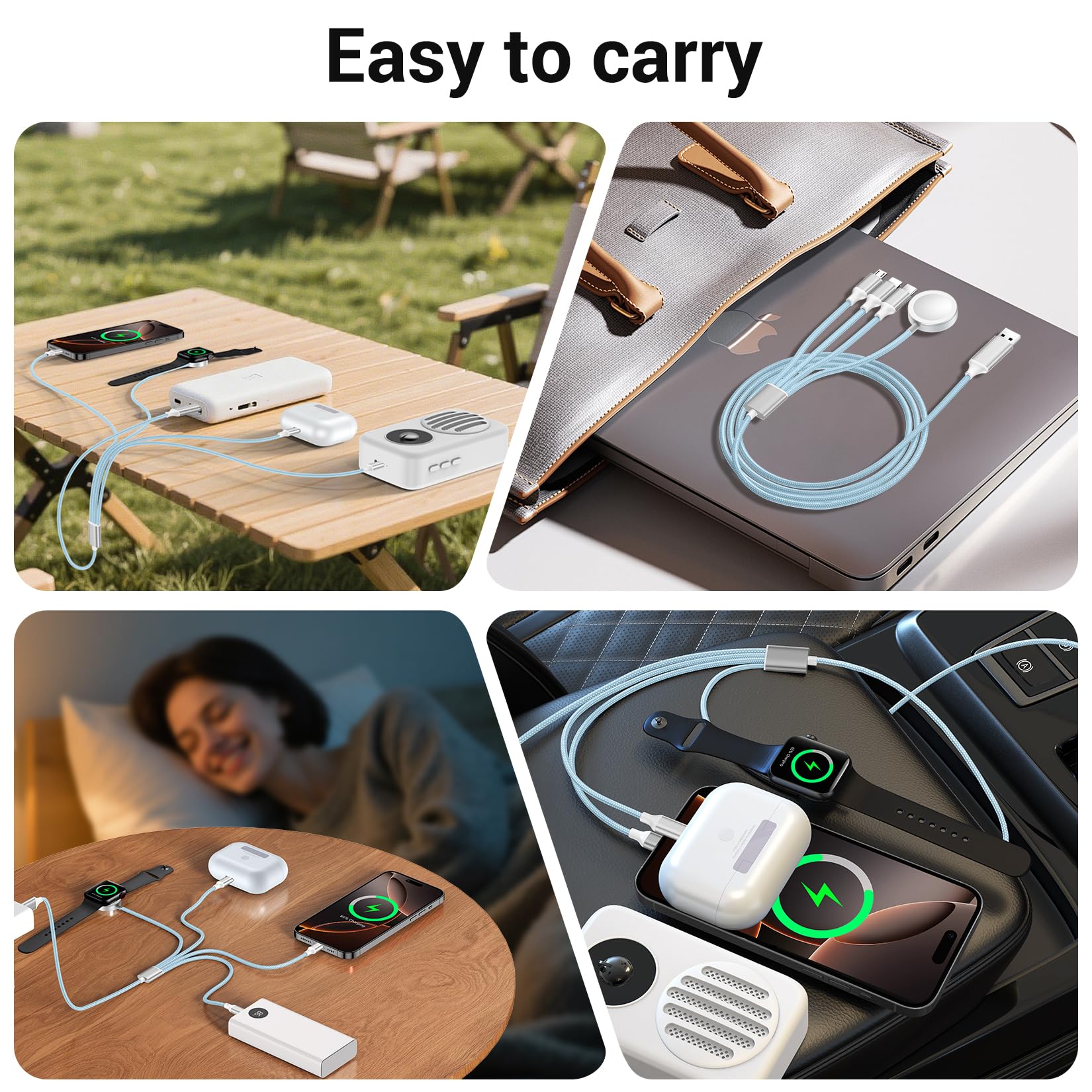 [Travel Vacation Essentials] With its lightweight and portable design, the travel charger for multiple devices is perfect for home, office, travel, car, sports, and more. During weekend getaways, this charging cords allows you to connect multiple devices without the hassle of tangled cables. The multi chargers for all devices takes up minimal space and helps keep your backpack or purse tidy.