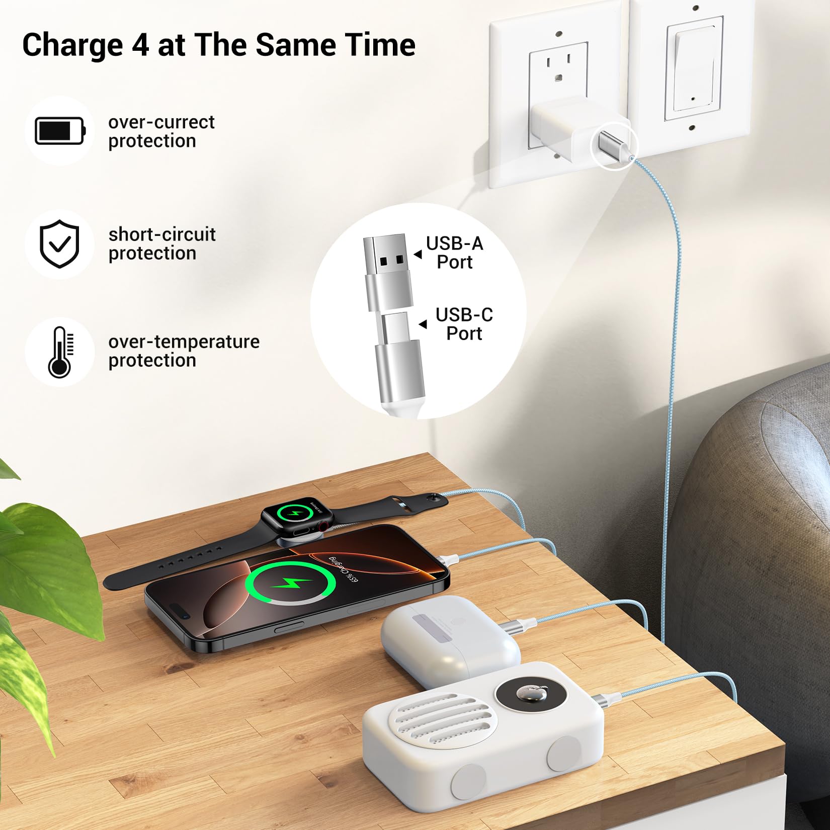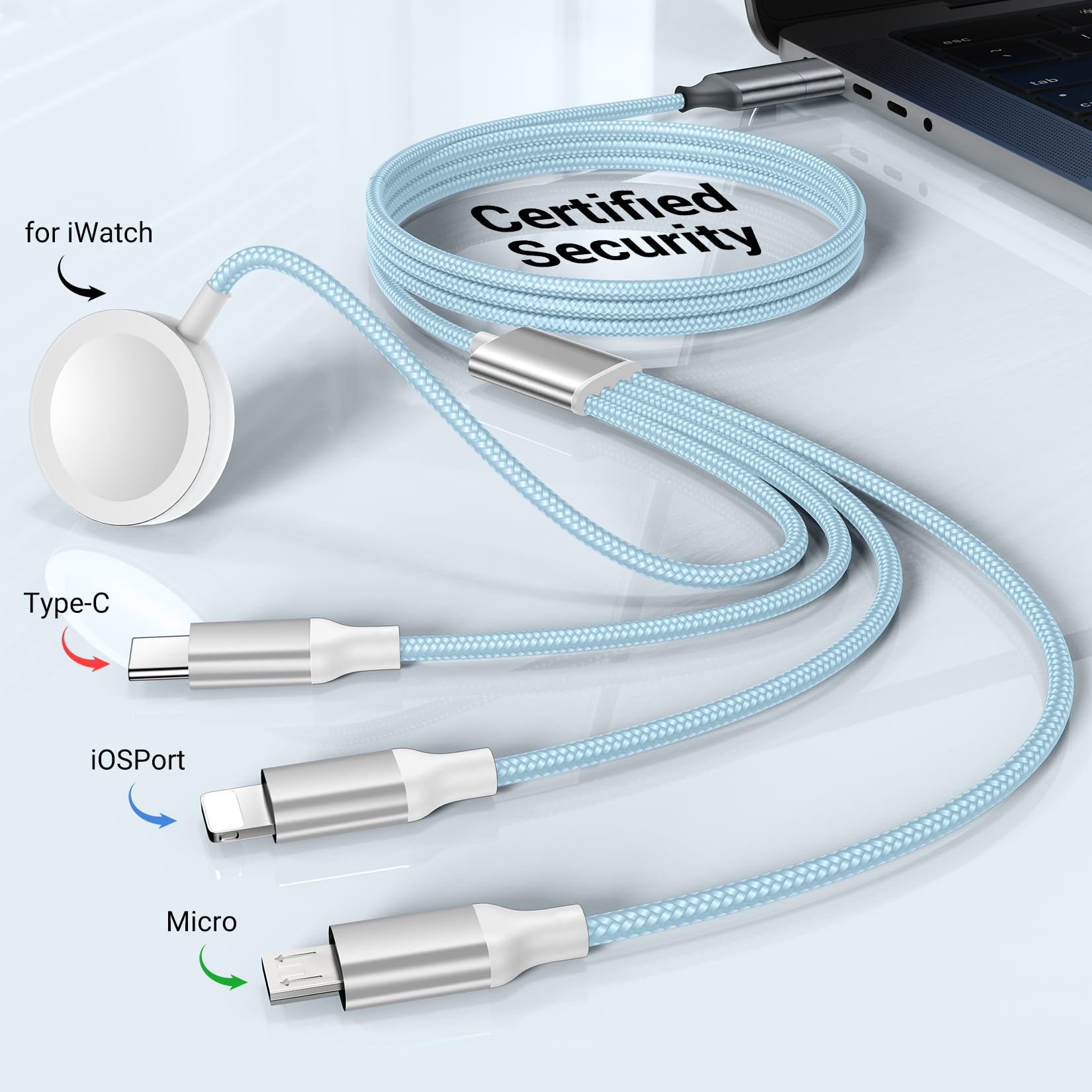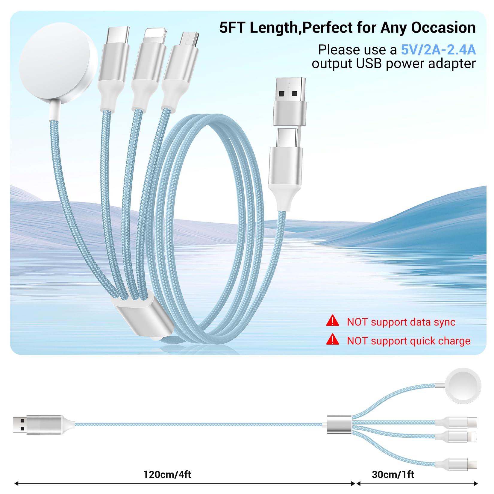 [4 in 2 Charging Cables] One cable = eight charging cables.The state-of-the-art 4-in-2 design features 4 different USB ports,including a watch port,iOS port,Micro USB,and Type-C,which support charging for most devices available on the market.Please note,this chargers for multiple devices is designed for charging only and does not support data syncing.
