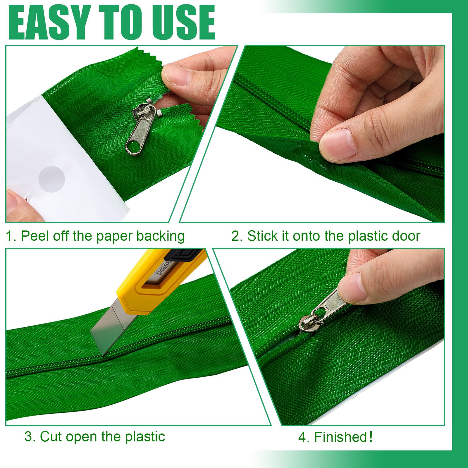 Simple to Use: the greenhouse zipper is quite user friendly; All you have to do is peel off the zipper backing and secure it to the plastic dust curtain; It is not prone to falling and offers a smooth open close operation, ensuring an easy usage experience