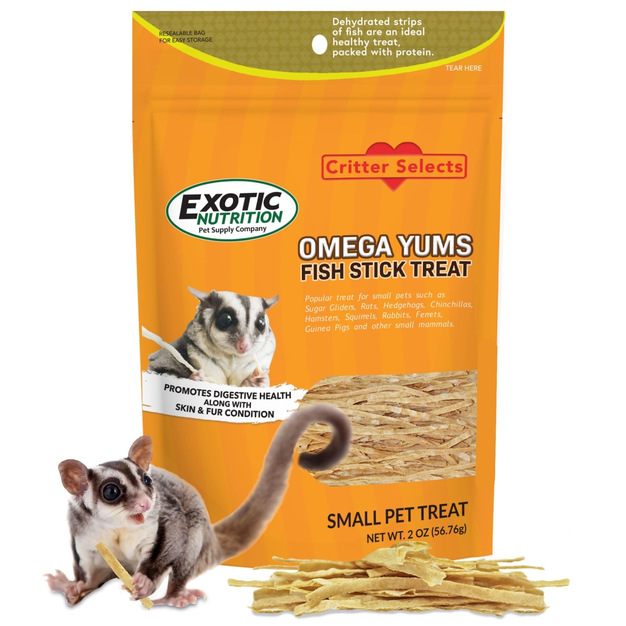 Exotic Nutrition's Omega Yums is a popular fish stick treat for small pets. SIZE: 2 oz. FEATURES: NUTRITIOUS - Variety of protein & calcium for Sugar Gliders, Hamsters, Squirrels, Hedgehogs, Chinchillas, Rabbits, Ferrets, and more. HEALTHY FUR - Omega nourishes the fur, making it look shinier. Benefits teeth and gums as well! HEALTHY - A healthy, natural treat for pets specially fortified with vitamins and minerals VARIETY - Lends variety to an otherwise monotonous diet ENRICHMENT - Adds behavioral enrichment for animals that spend their lives in a small, limited environment BONDING - Forms a connection between pets and pet owners DENTAL HEALTH - Provides good exercise for teeth and jaws FEEDING RECOMMENDATION: These products are treats and should be fed sparingly, they are not a substitute for a regular, balanced diet.