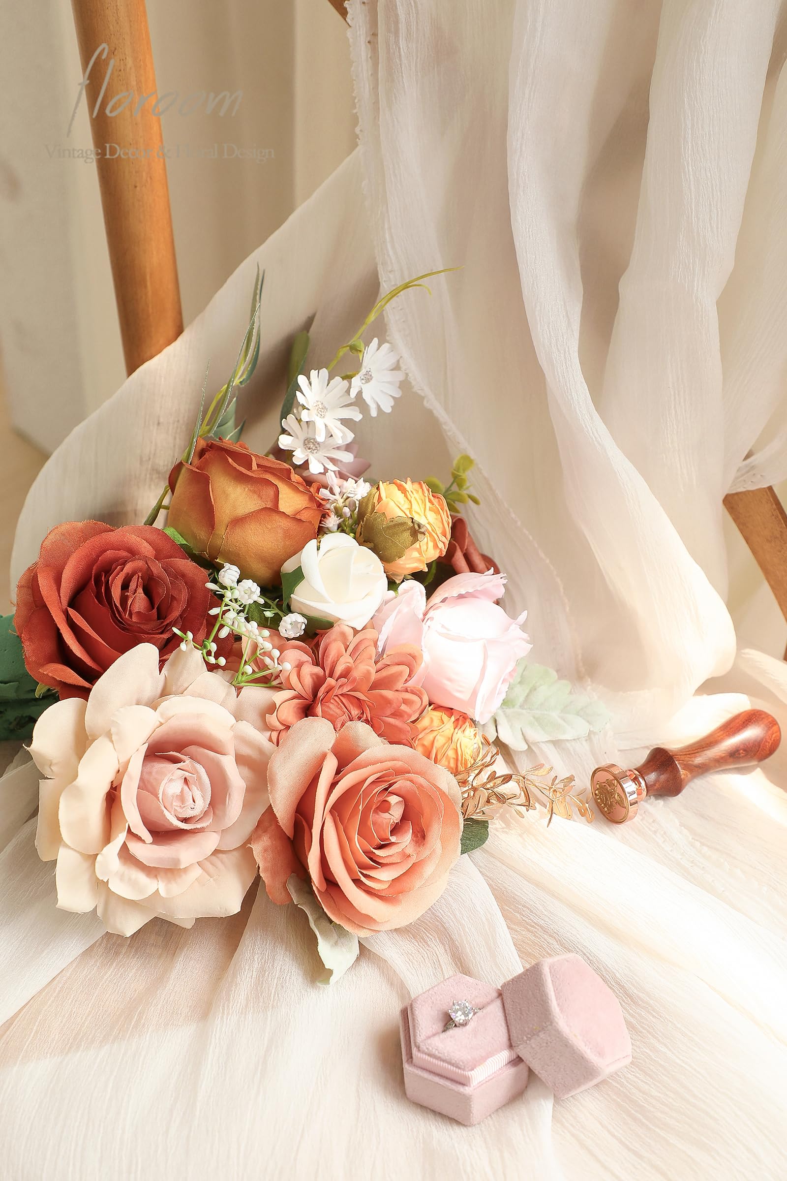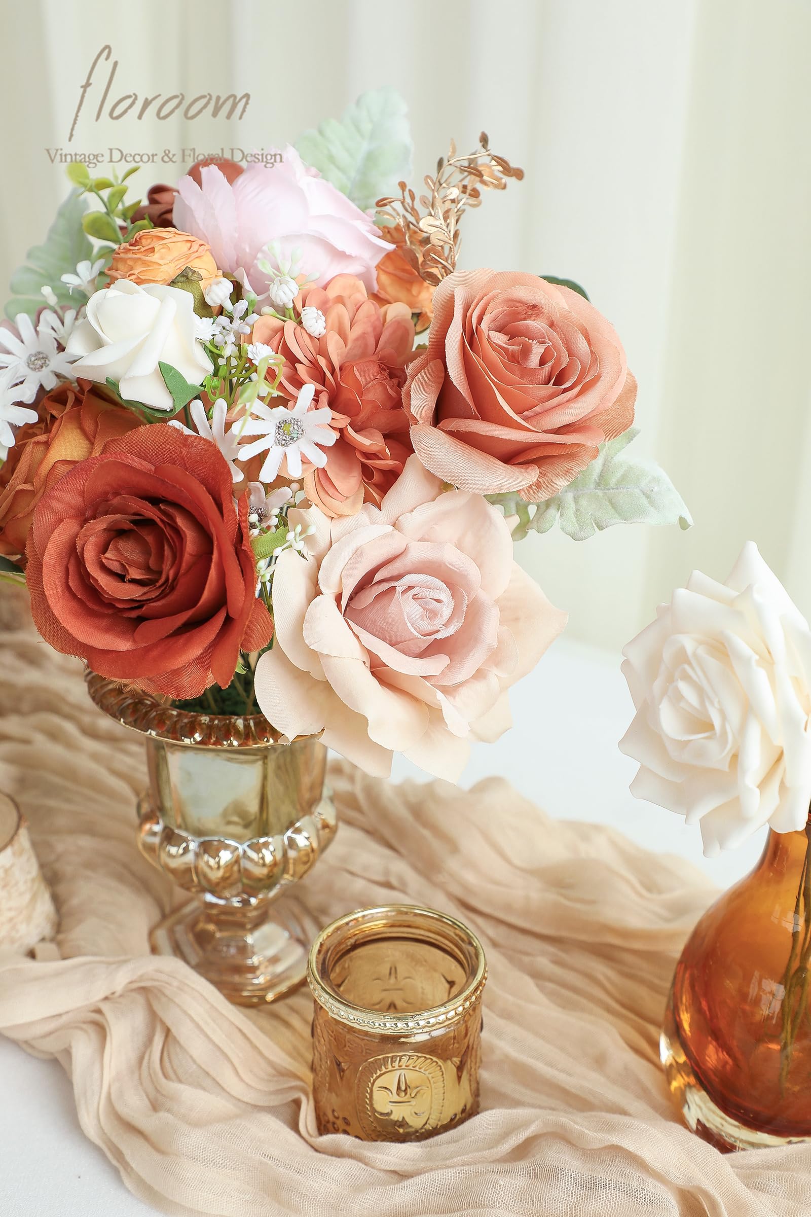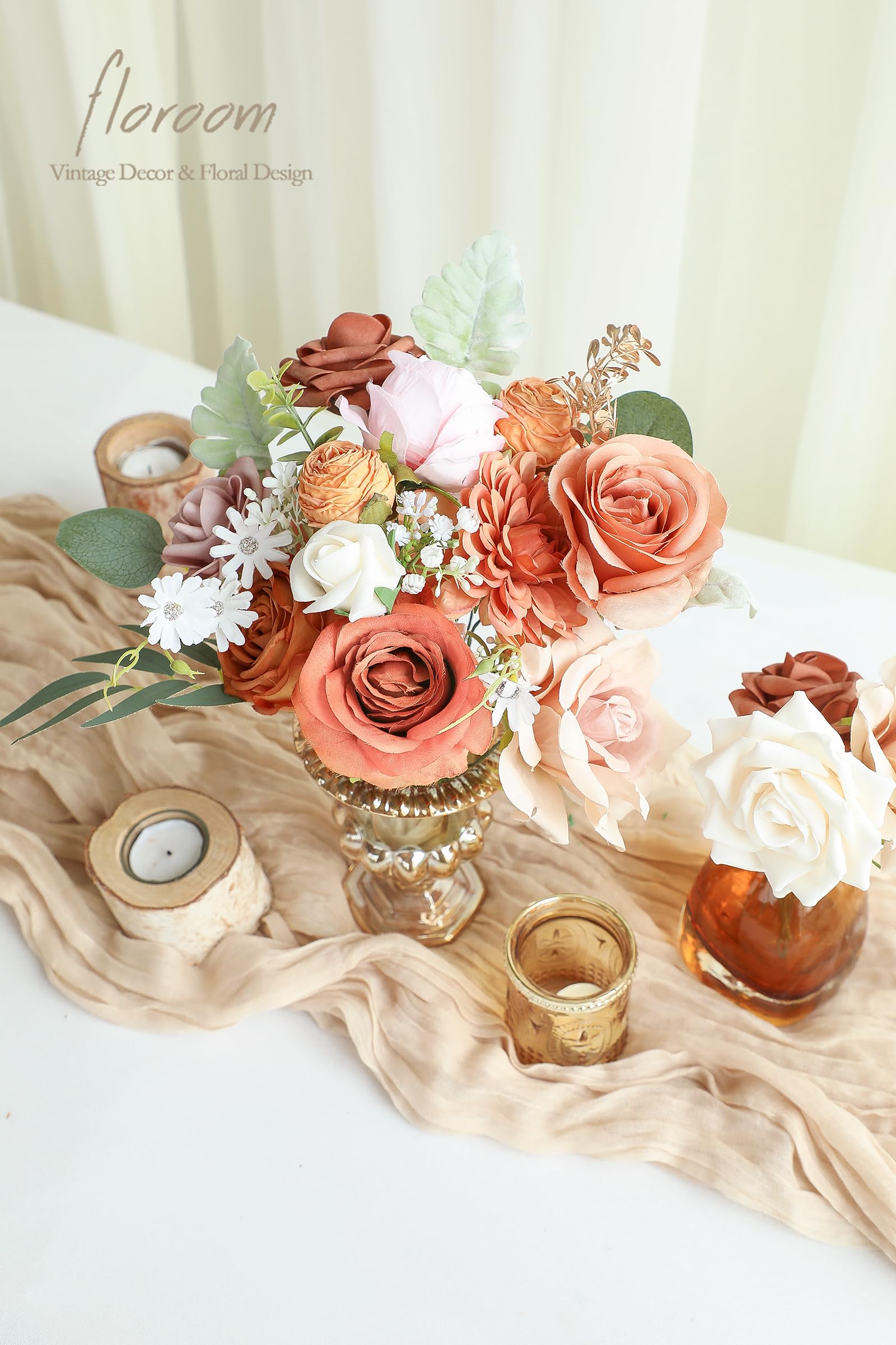 ❤️ Package Details: Includes faux silk flowers with burnt orange dahlias, peonies, and amber roses; foam flowers feature terracotta and cream roses. Also contains eucalyptus leaves as accessories.