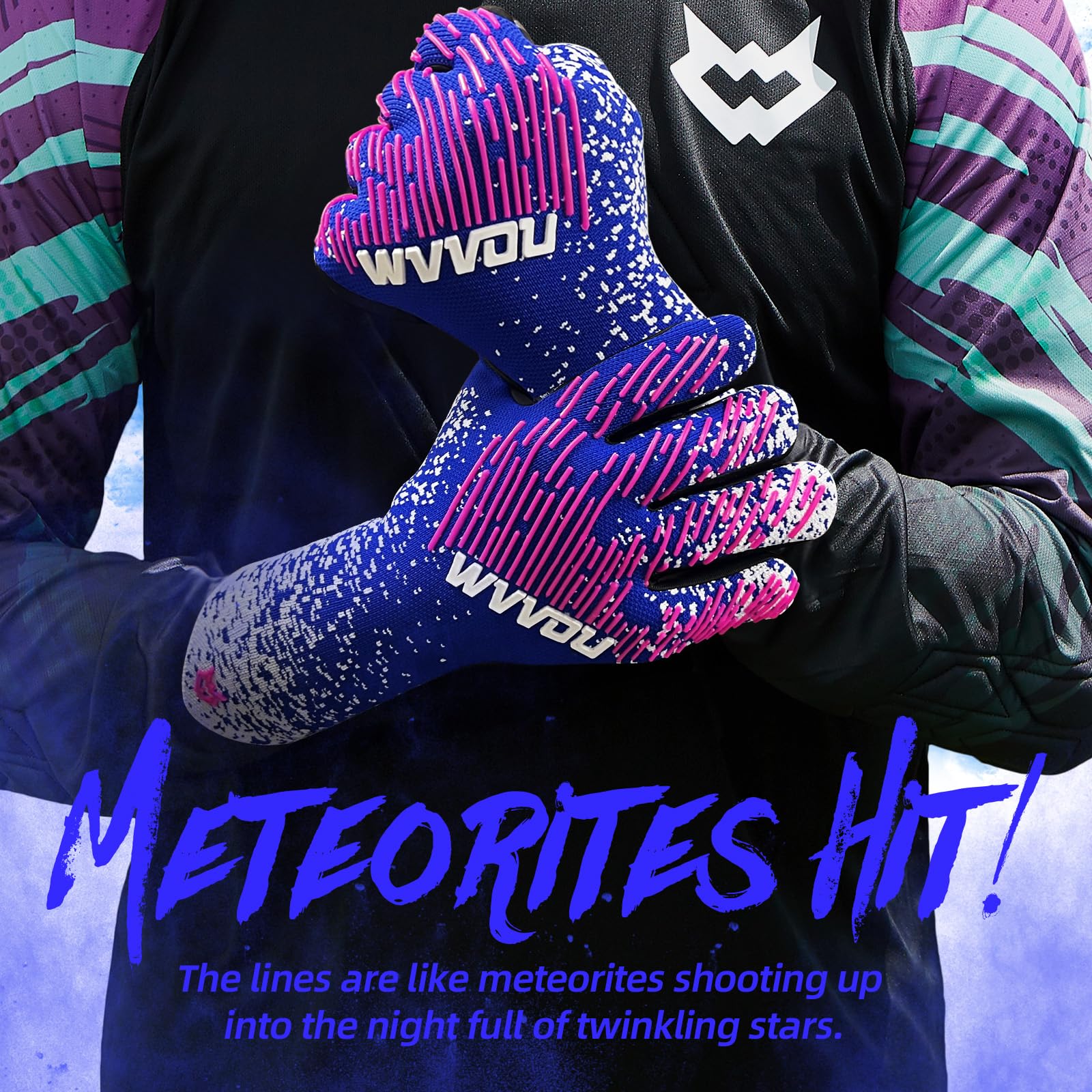 AESTHETICALLY APPEALING: Patterns on the knitted fabric are like twinkling stars of the Milky Way, while raised blue lines are the meteorites shooting up into the still night air; exactly as what the goalkeepers are to the pitches; surgent power output makes brilliant saves easier on the trigger. Every goalkeeper will have long-term fun due to our goalie gloves youth adults and enjoy wonderful performance by themselves!