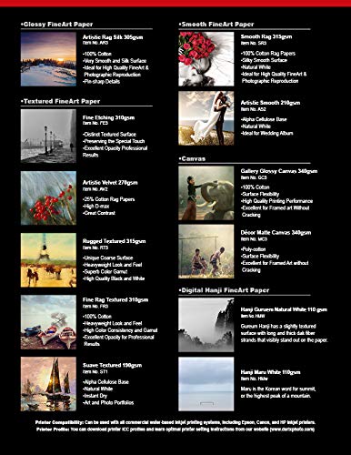 This trial kit includes two sheets each of the following Fine Art papers. 1) Suave Textured, 2) Artistic Smooth, 3) Smooth Rag, 4) Rugged Textured, 5) Fine Etching, 6) Artistic Velvet, 7) Artistic Rag Silk, 8) Fine Rag Textured, 9) Décor Matte Canvas, 10) Gallery Glossy Canvas. Each of our Fine Art papers have a unique texture, thickness, white balance, and glossiness. Try test printing using this trial kit before purchasing your favorite Fine Art paper. Please check with your printer manual to confirm compatibility with Fine Art papers.