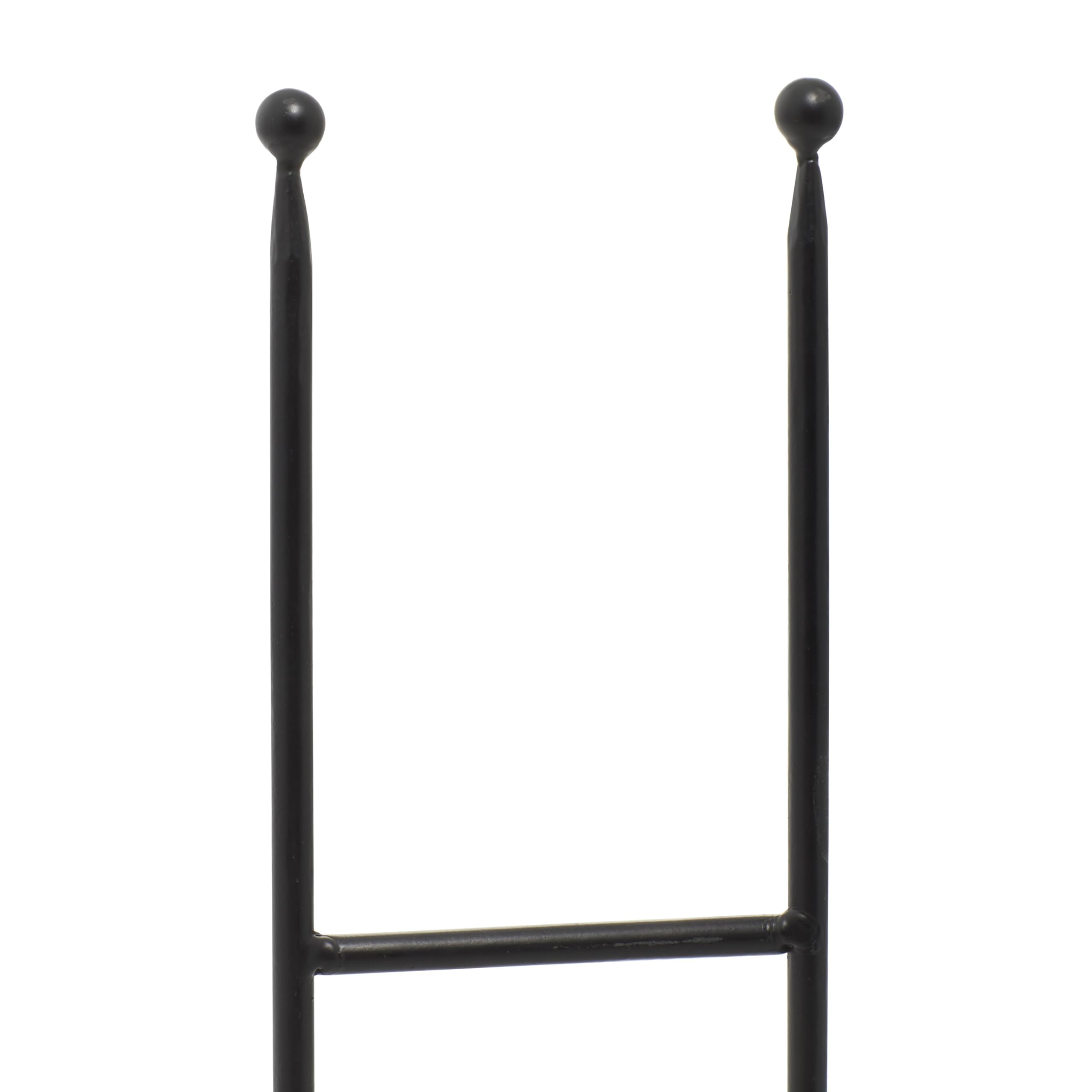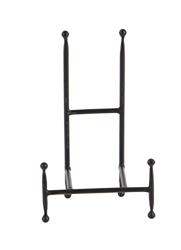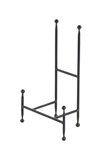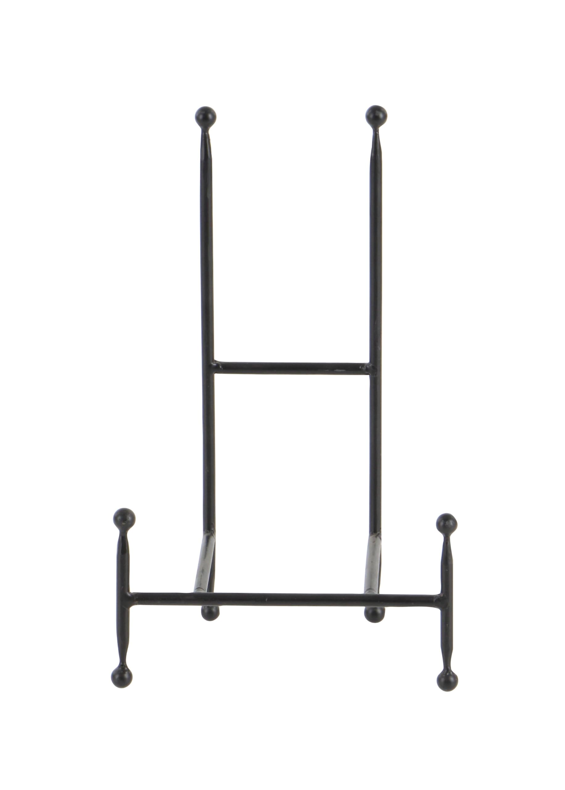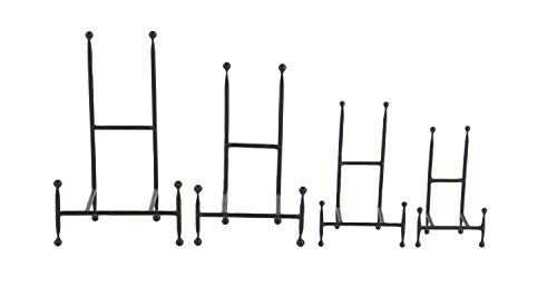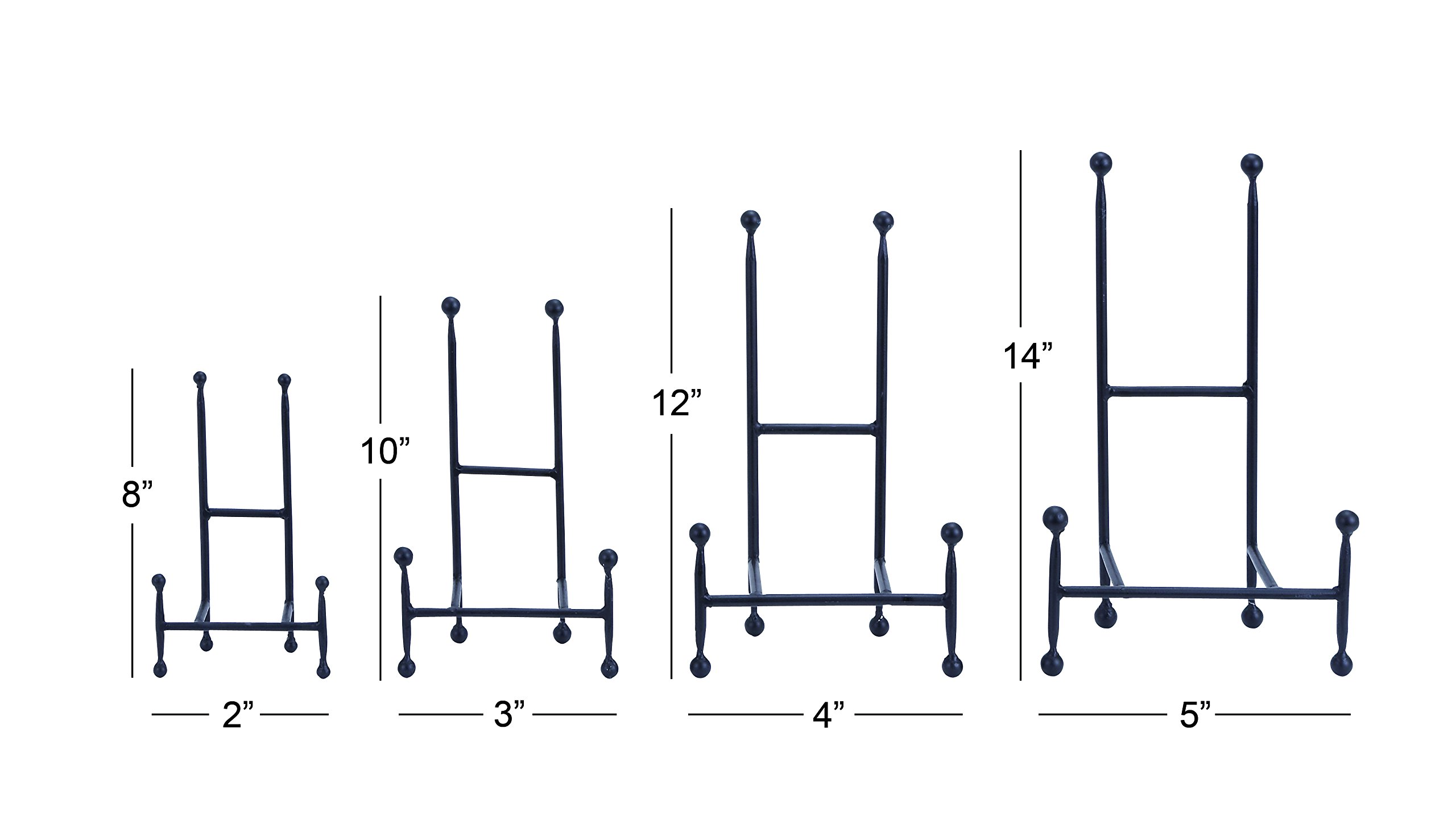 Item description: set of four 14", 12" 10" and 8" new traditional iron easels, tarnished finish black iron posts with ball-tip ends, connected h-beams, tall in back, short and wide in front.