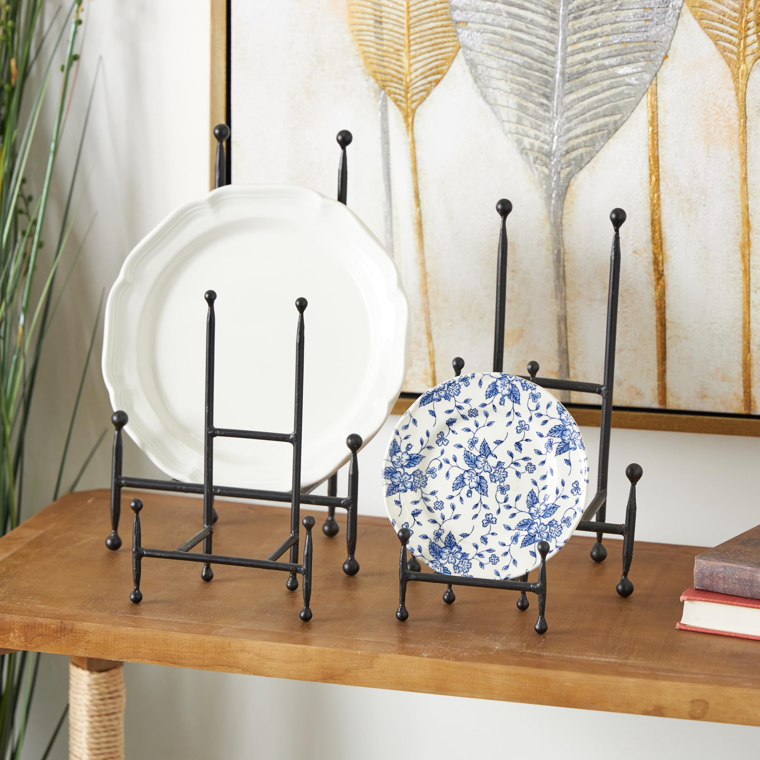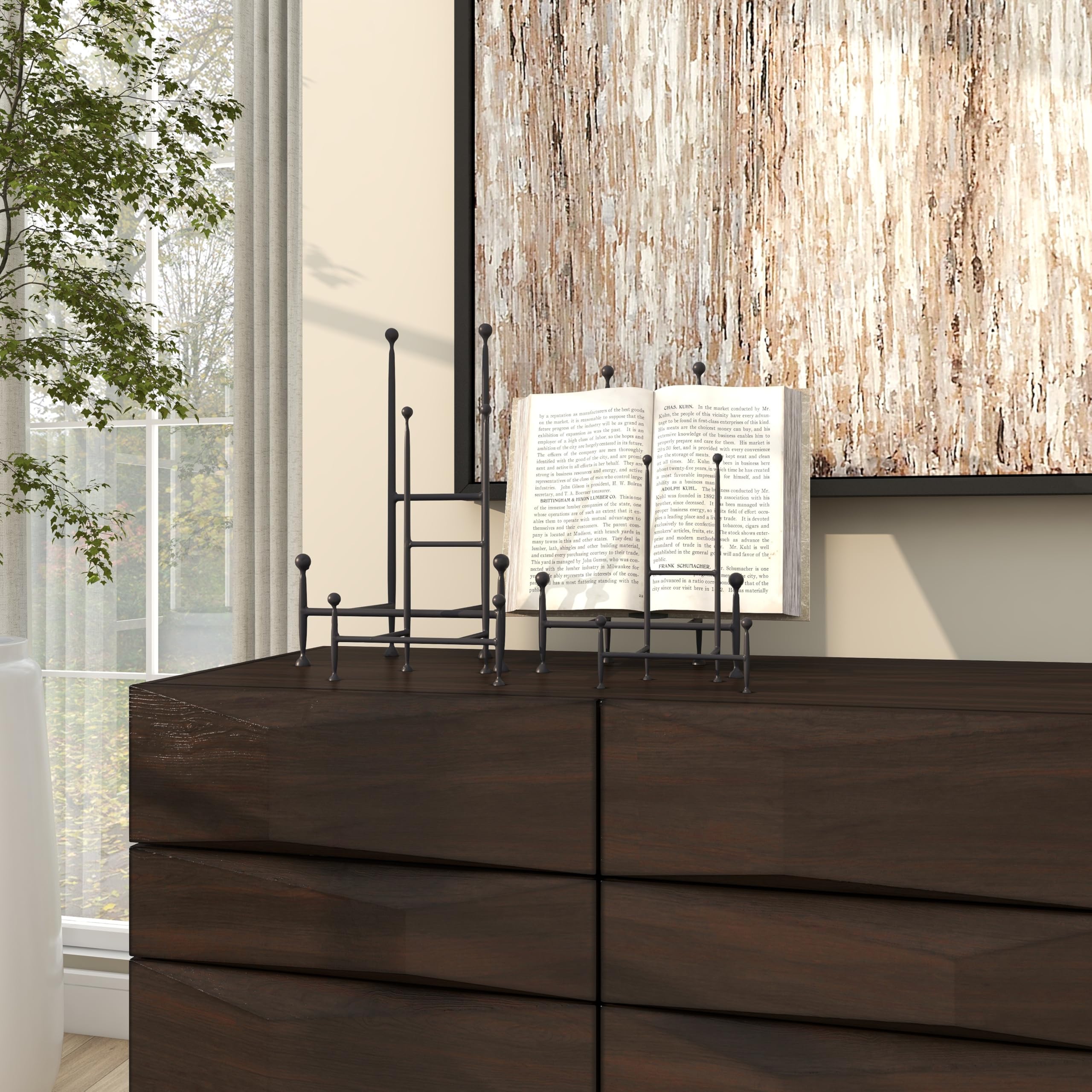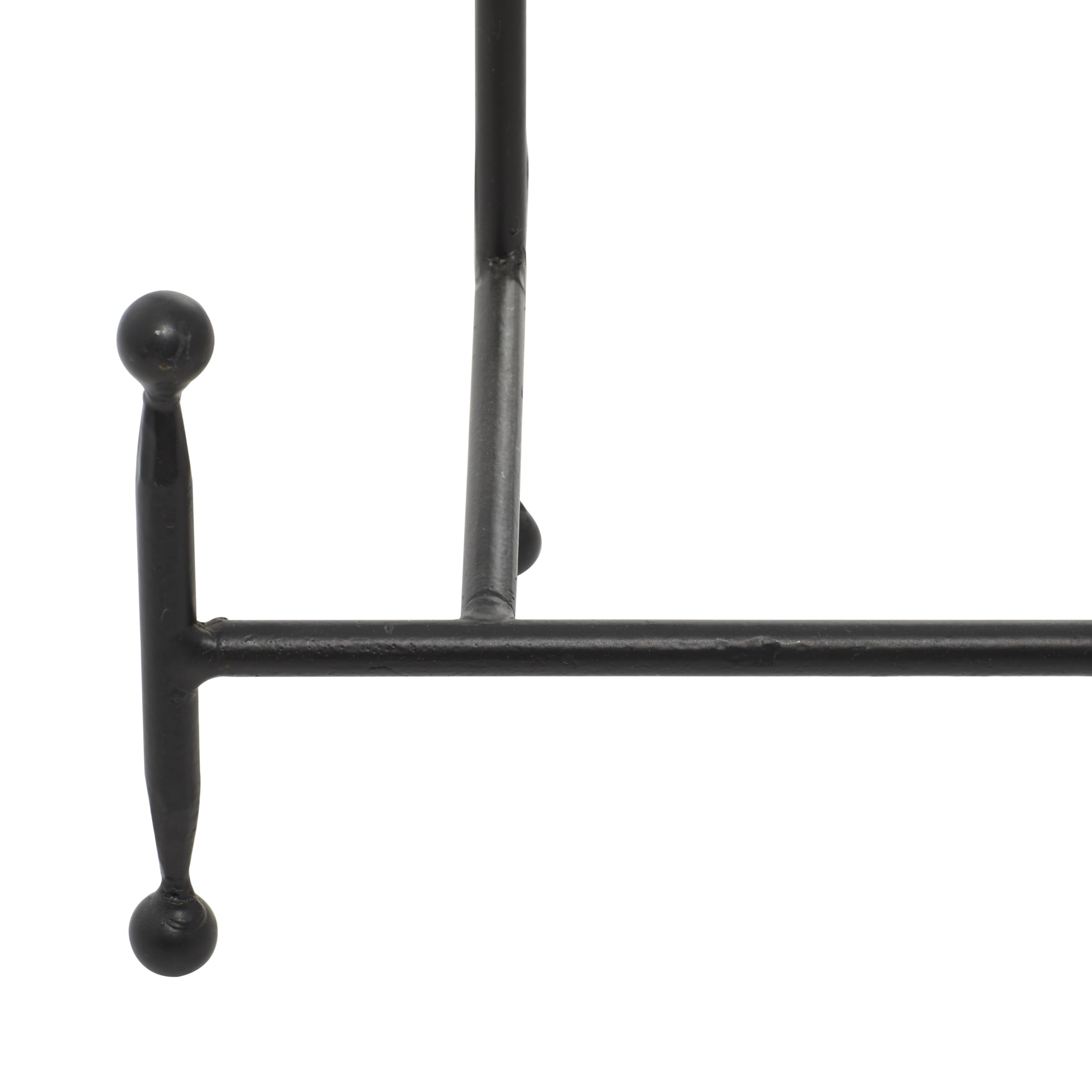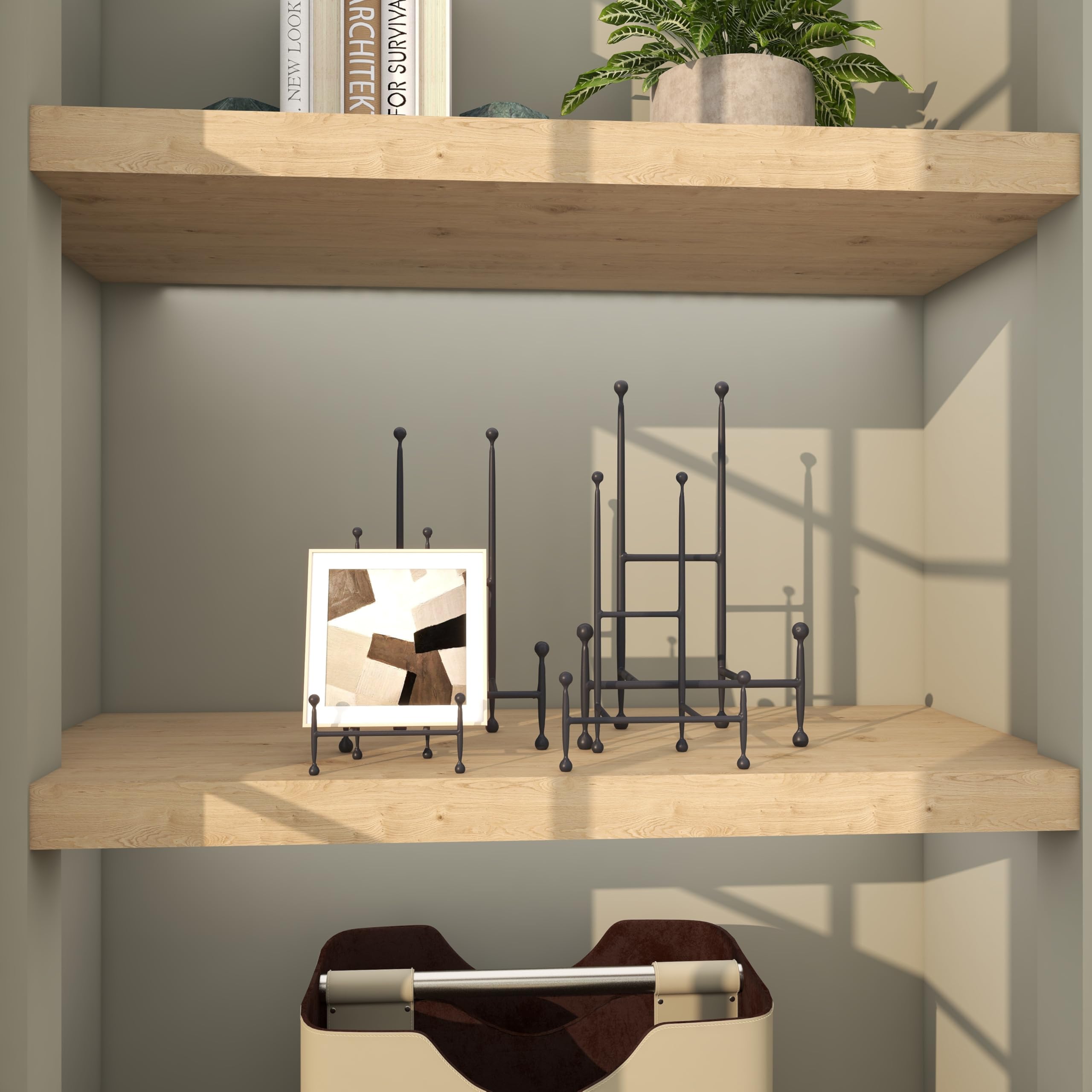 Item description: set of four 14", 12" 10" and 8" new traditional iron easels, tarnished finish black iron posts with ball-tip ends, connected h-beams, tall in back, short and wide in front.