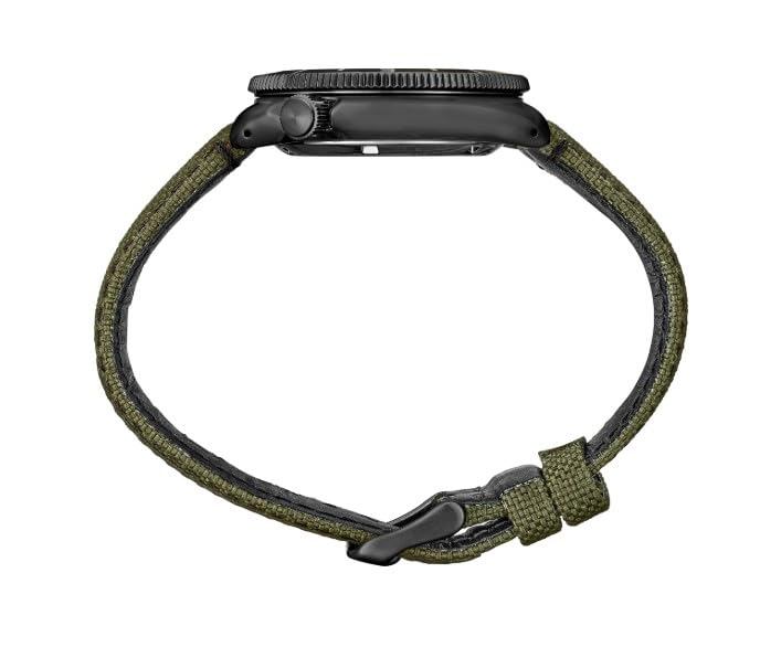 Durable green fabric/leather hybrid strap.