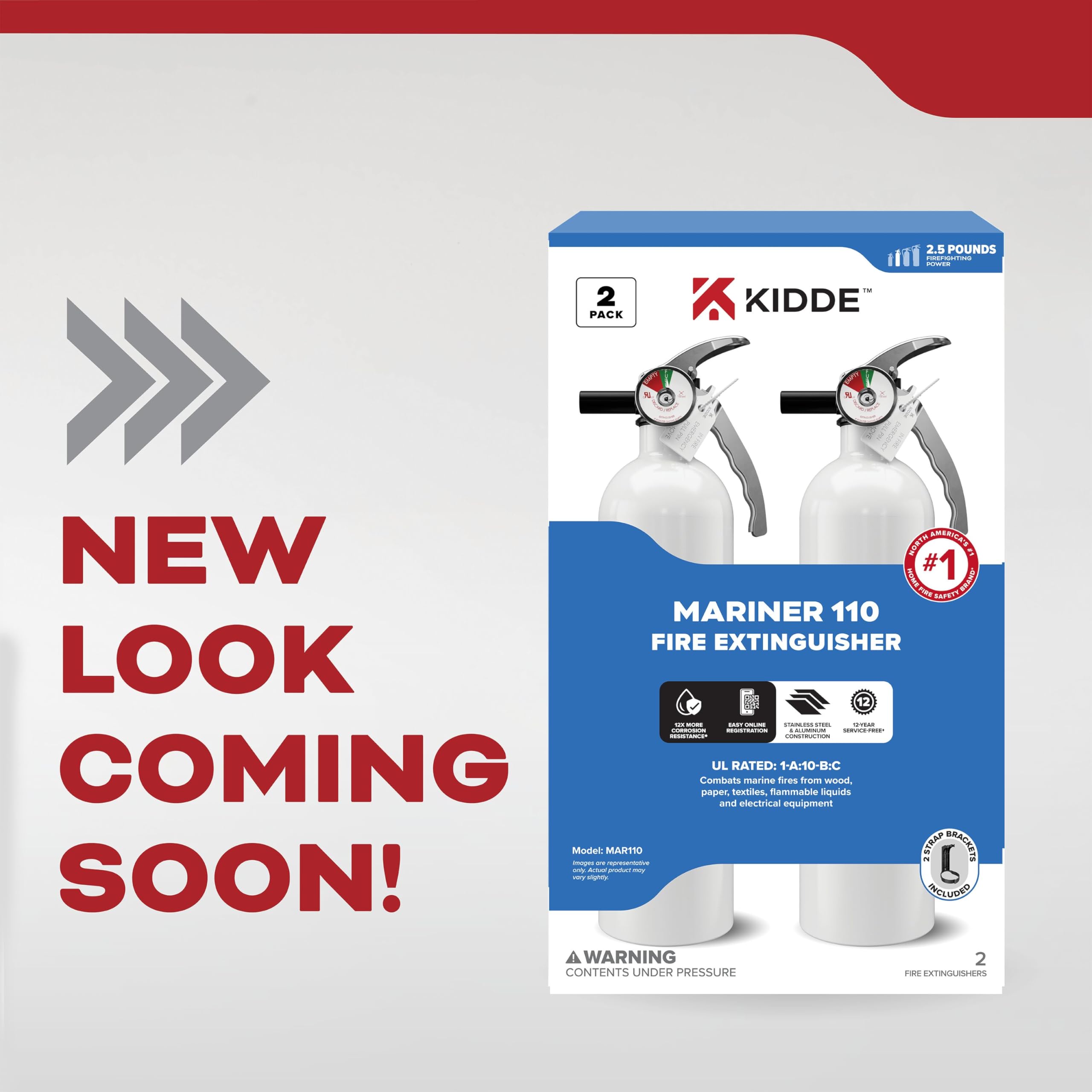 Protect yourself on the water with the Kidde Fire Extinguisher for Boats, Single-Use 1A10BC, 2 Pack, designed to stop marine fires involving trash, wood, paper (Class A), liquids and gases (Class B), and electrical equipment (Class C). The simple & reliable operation is designed to combat fire hazards using the PASS (Pull, Aim, Squeeze, Sweep) firefighting method to fight fire from 4 to 6 feet. Constructed from lightweight, durable aluminum, it includes an easy-to-read pressure indicator, corrosion-resistant metal valve assembly, and ergonomic, rust and impact resistant steel handle, ideal for years of service on the water. A strap bracket makes it easy to mount for quick access in an emergency, and the easy-to-pull safety pin design ensures fast activation. Dispose & replace if used, discharged, or if the fire extinguisher is over 12 years old. UL Listed. 12-year limited manufacturer's warranty. Note that the dry chemical agent in this fire extinguisher is non-toxic but may cause skin irritation. Recreational boats over 26 feet may require more than one fire extinguisher. Place a Kidde fire extinguisher within easy reach where fires are more likely to start. *Compared to industry saltwater test standards.