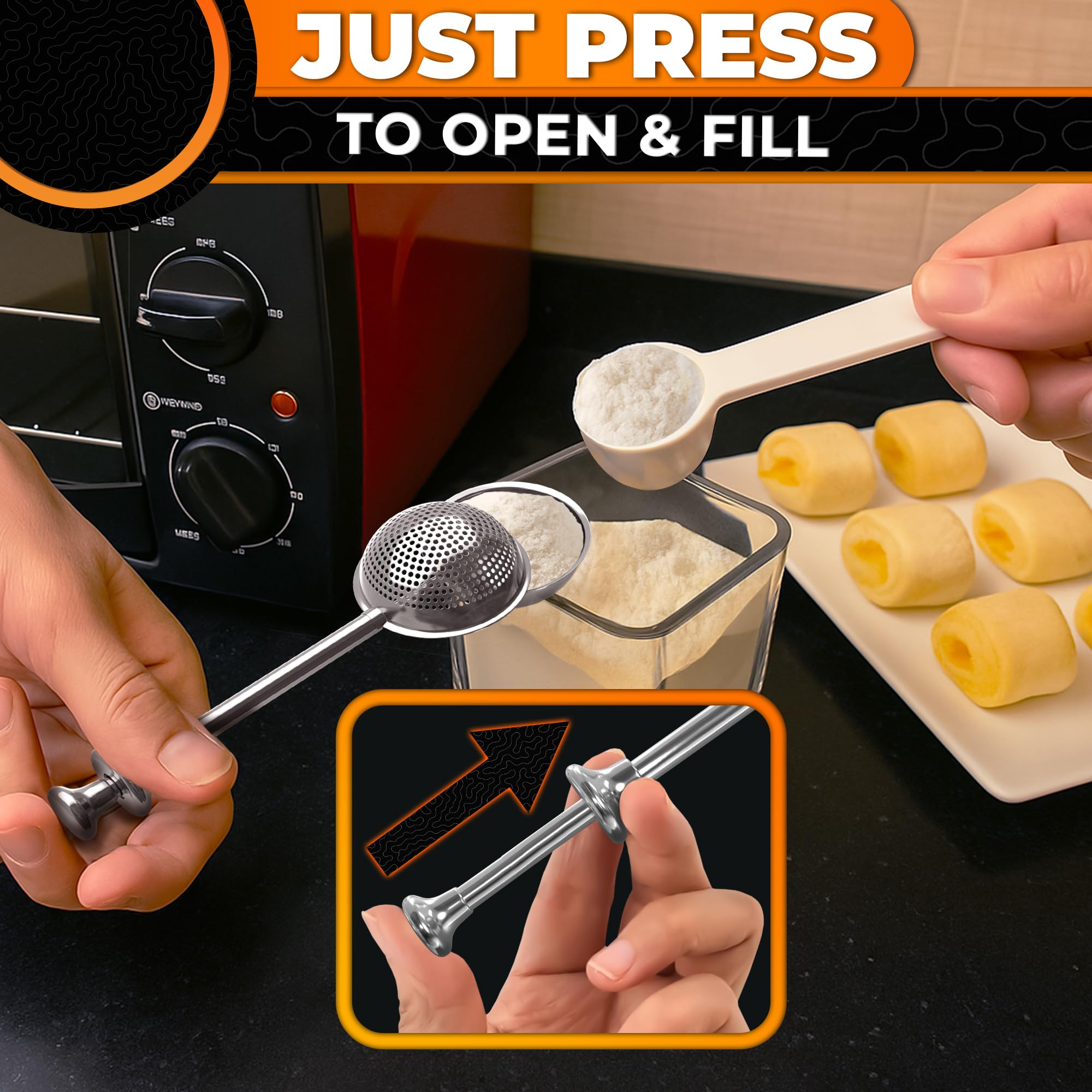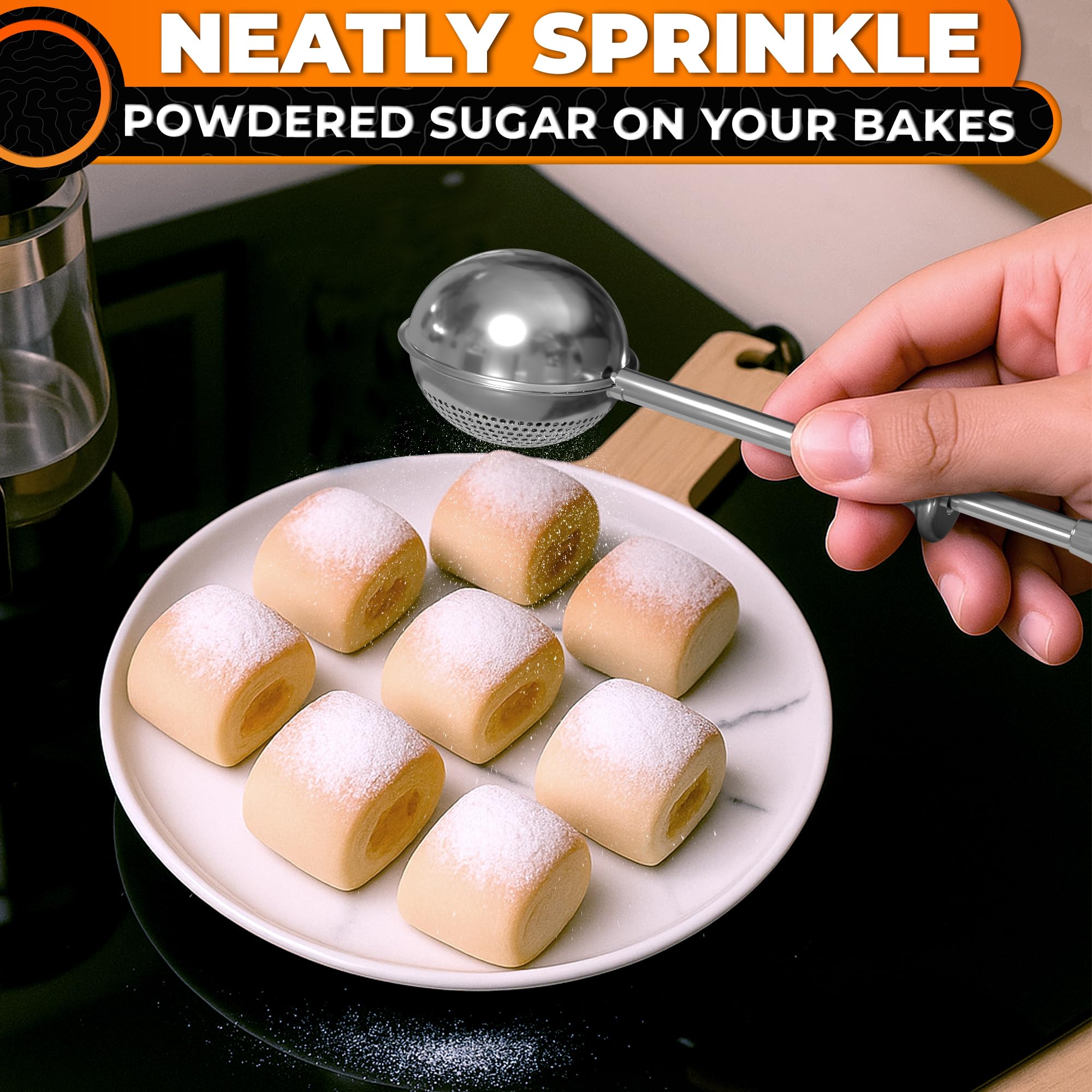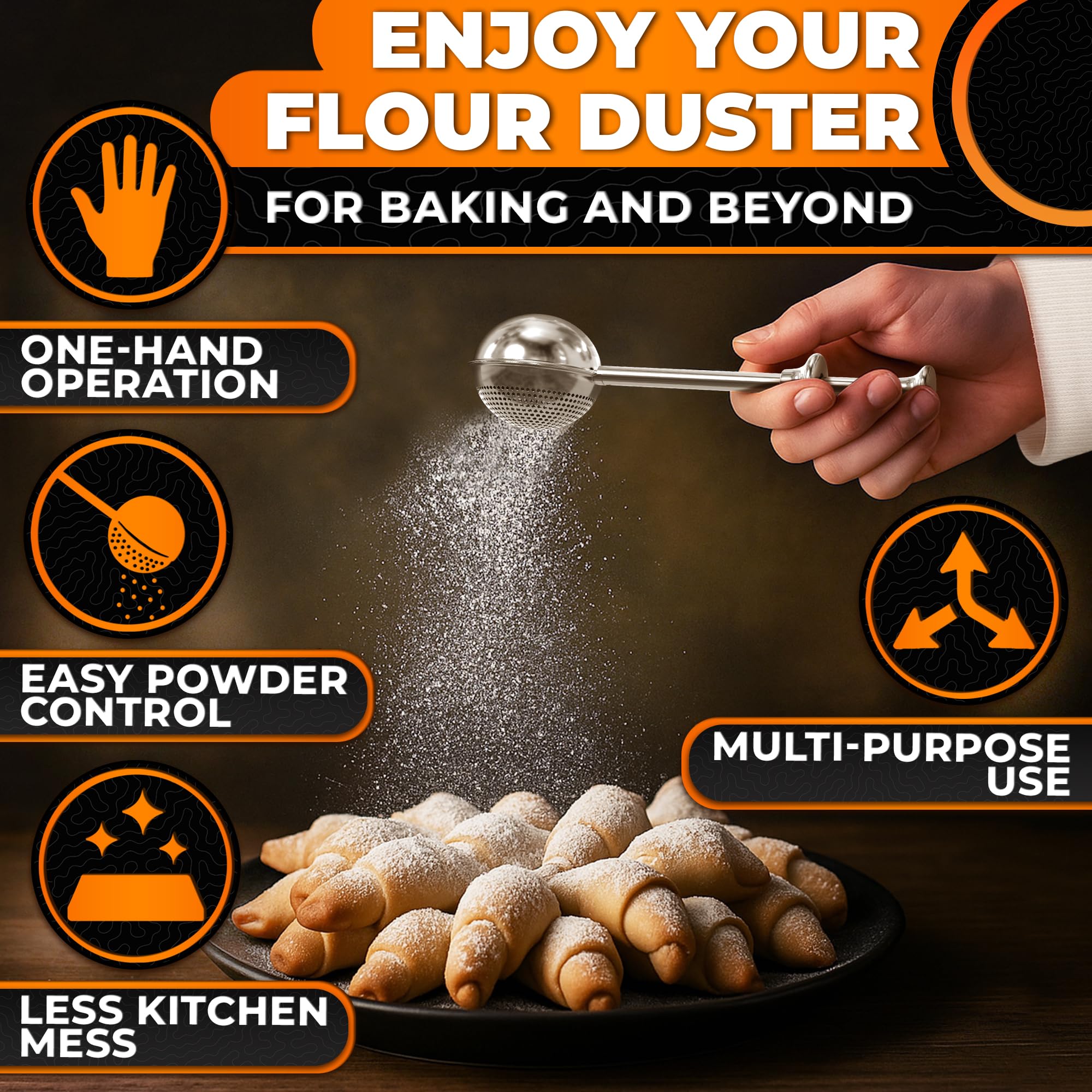 Dual-Function Powdered Sugar Duster: Features a perforated side for even distribution & a non-perforated side to scoop flour. This flour dusting wand for baking allows you to dust exactly where needed