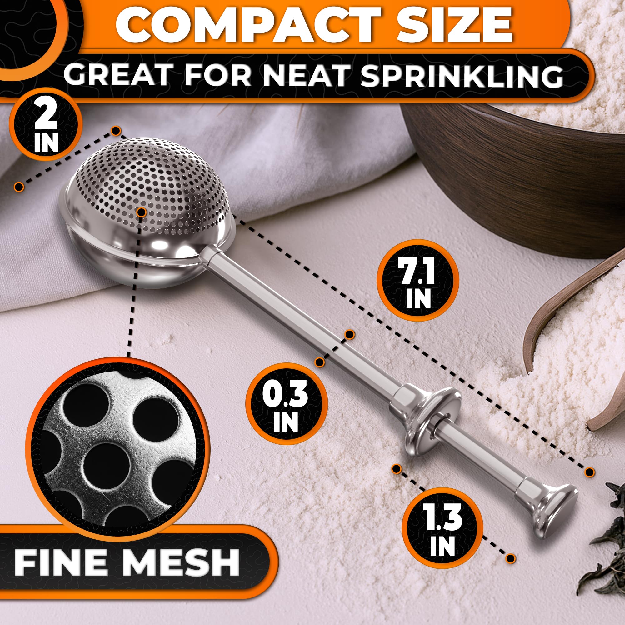 Compact & Easy to Store: The compact size (7.1 in x 2 in) of the powdered sugar sifter makes it easy to store. This small sifter for powdered sugar is well-suited for family bakers & pastry chefs