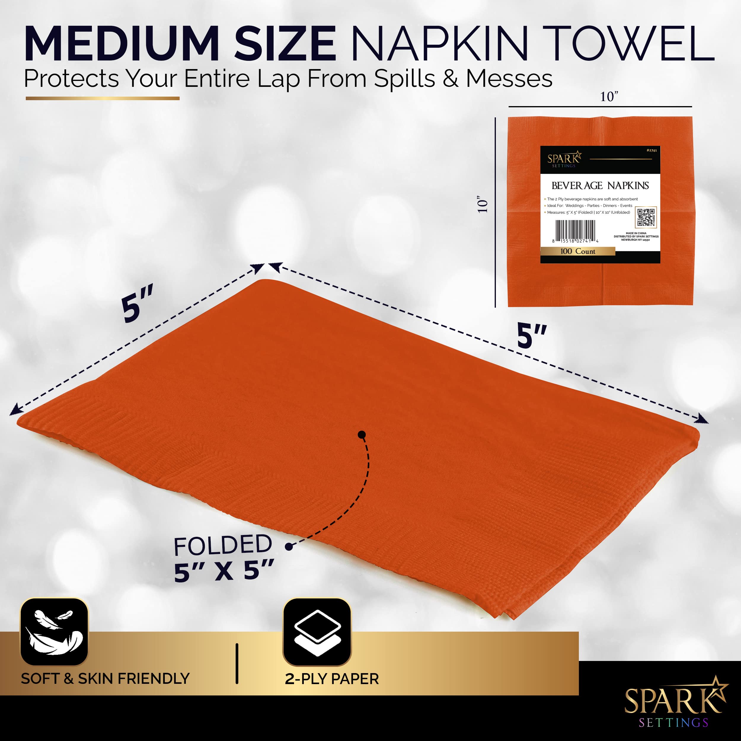 ✓SPECS - Paper cocktail napkins are disposable 2-ply dessert napkins. Paper napkins everyday have bright and vibrant colors black orange clear lime purple white blue green red pink gold burgundy and Silver. Lunch napkins are folded 5” x 5” and unfolded 10” x 10” comes in 100 pack and serve with any beverage.
