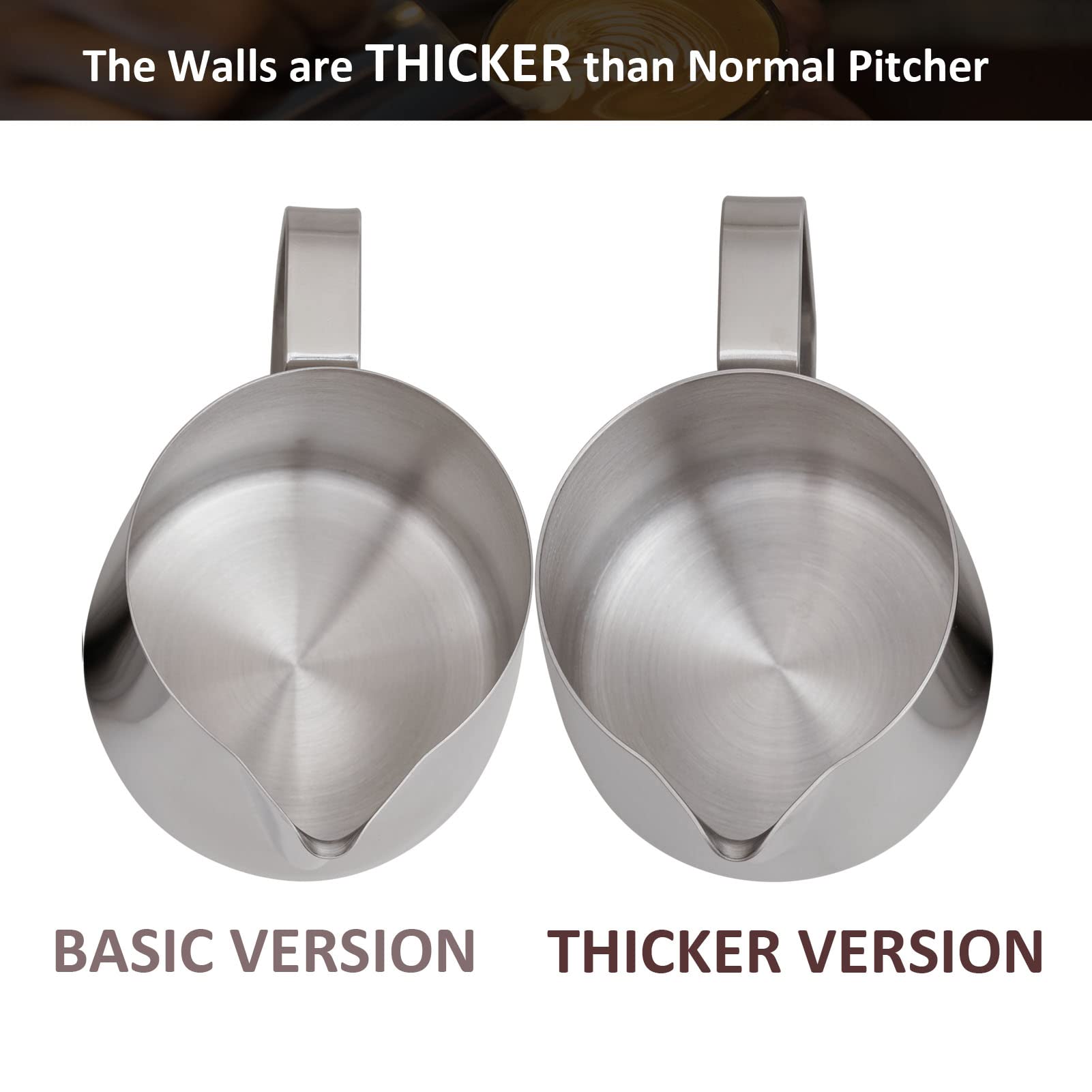 Upgraded Thicker Version: The frothing jug walls and the handle are thicker than normal frothing pitcher in the market. Finished beautifully with all smooth edges. The outside has a mirror finish with our Adorever logo and the inside is brushed. The premium rust and stain-proof construction ensure longevity and easy-to-clean convenience.