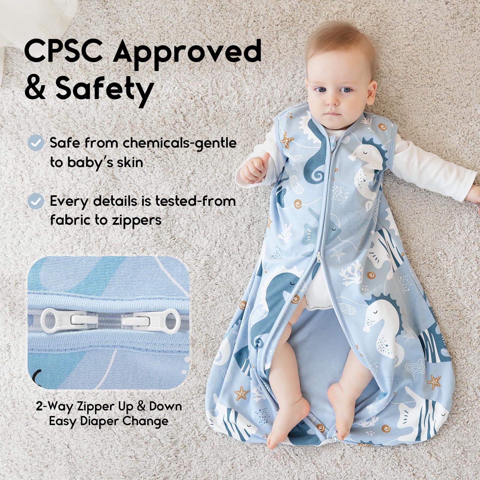 Smooth Double Zipper - Our wearable blanket baby feature a 2-way zipper, so you can unzip from the bottom to to change diapers, disturb baby even less during the night. Then you can enjoy a sweet night with little one ! Zipper protectors on the top will protect baby's jaw from scratches.