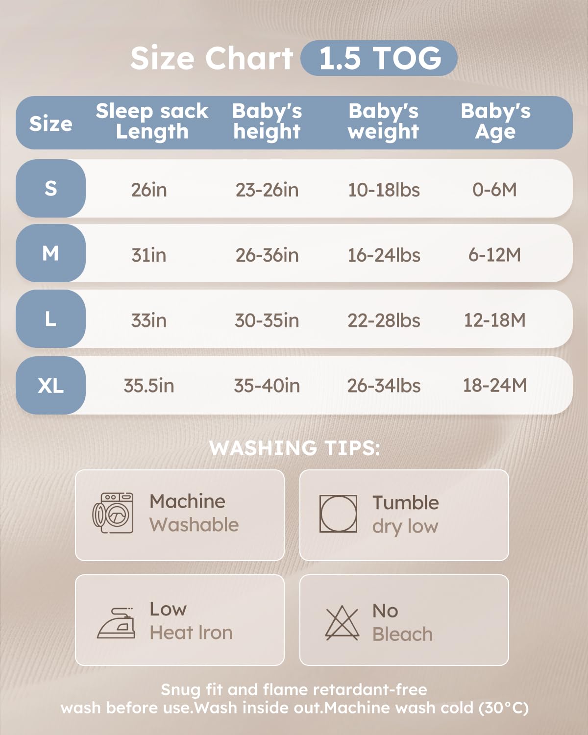 Machine Washable - The baby wearable blanket come with 2 pack, convenient for the baby to change at any time. There are 4 sizes available sleep sack for your choices: S for 0-6 Months; M for 6-12 Months; L for 12-18 Months; XL for 18-24 Months. Please measure your baby's height and weight and refer to our size chart carefully before choosing. These baby sleep sacks are machine washable, tumble dry at low temperatures(<30°C/ 86°F).