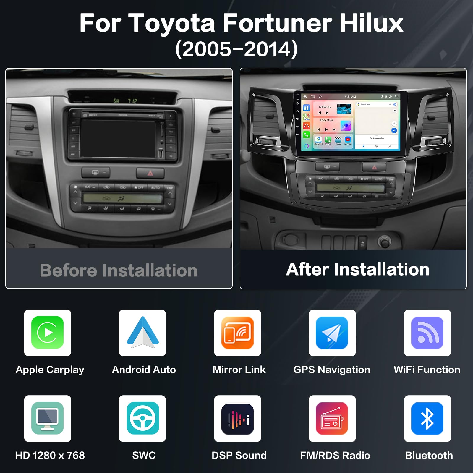 Applicable Models & Years: This upgraded replacement dash kit is for toyota fortuner hilux 2005 2006 2007 2008 2009 2010 2011 2012 2013 2014 with Manual A/C and Auto A/C. The stereo comes with an in-dash head unit, wiring harness cables and frame panel. Supports most stock features - power amplifier, steering wheel controls and more. Please check if the power cable port on the detail page matches your original car before purchasing
