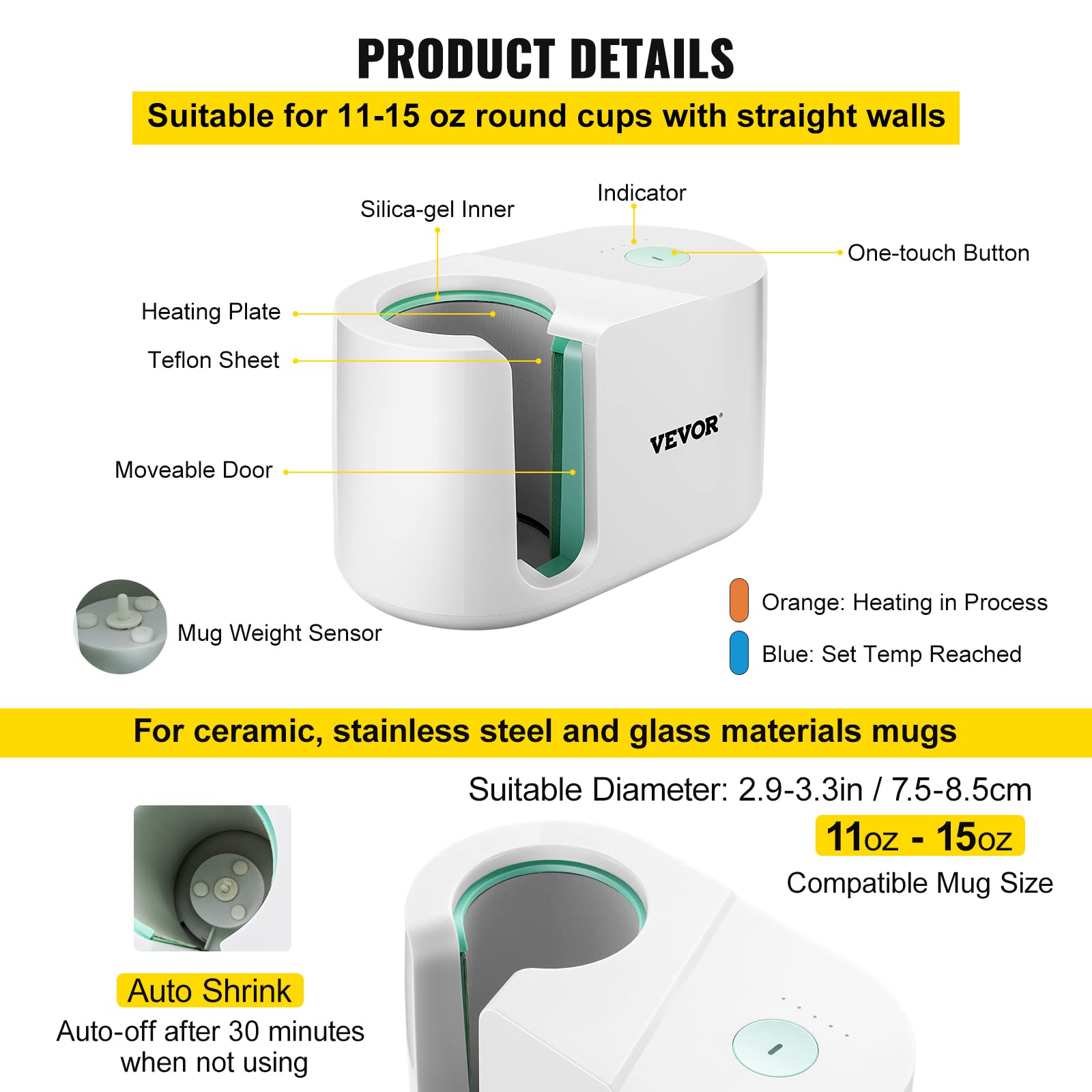 【Excellent Consistent Results】: This auto mug presser makes it easy to achieve flawless sublimation transfers with a stylish, space-saving, and rounded exterior design. Suitable for 11-15oz round cups with straight walls. This press not only can press on ceramic mugs but also be used on stainless steel and glass materials.