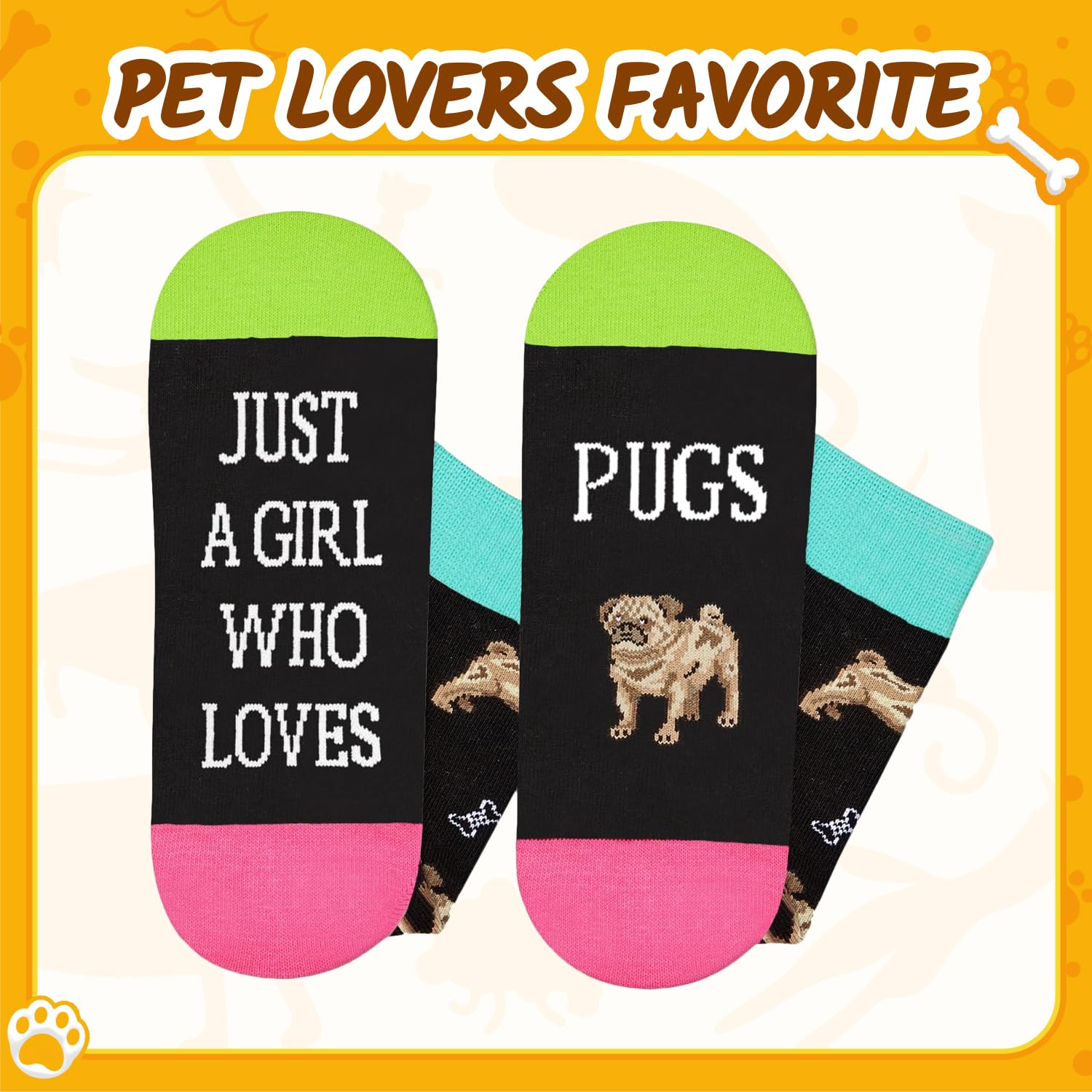 PUGS SOCKS: Our funny socks are designed for women and feature cute Pugs and bones in black, with the funny sayings "JUST A GIRL WHO LOVES PUGS."