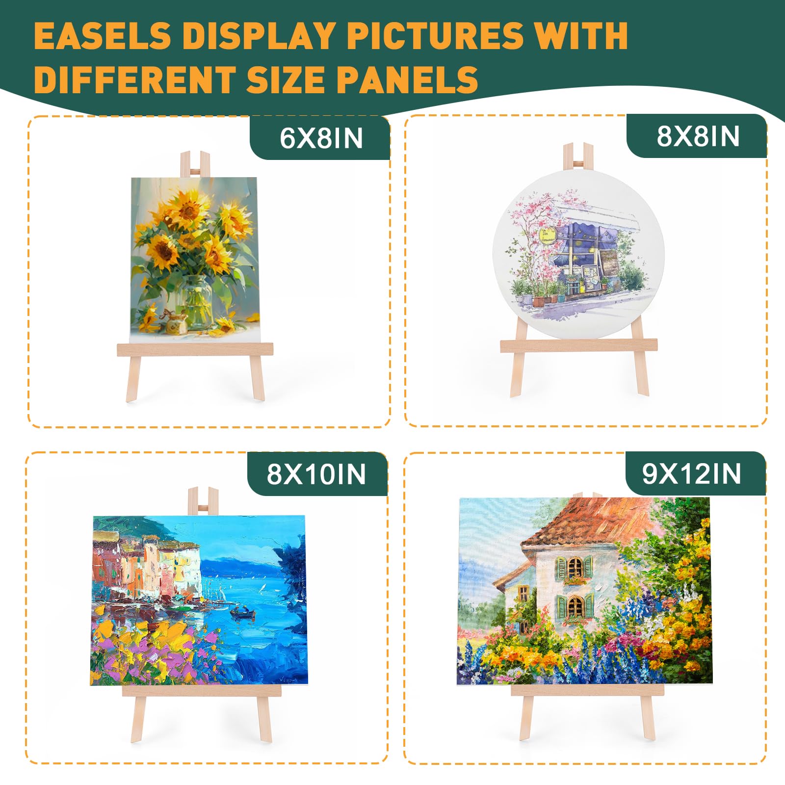 【Painting Set】: The set has2wood easels(11in), 2*10 PCS brushes,2PCS 12 color tubes (12ml, 0.4 oz) acrylic paint, 2 palettes,2 PCS 8”*10” and 2PCS 8”*8”round canvas and a gift box.