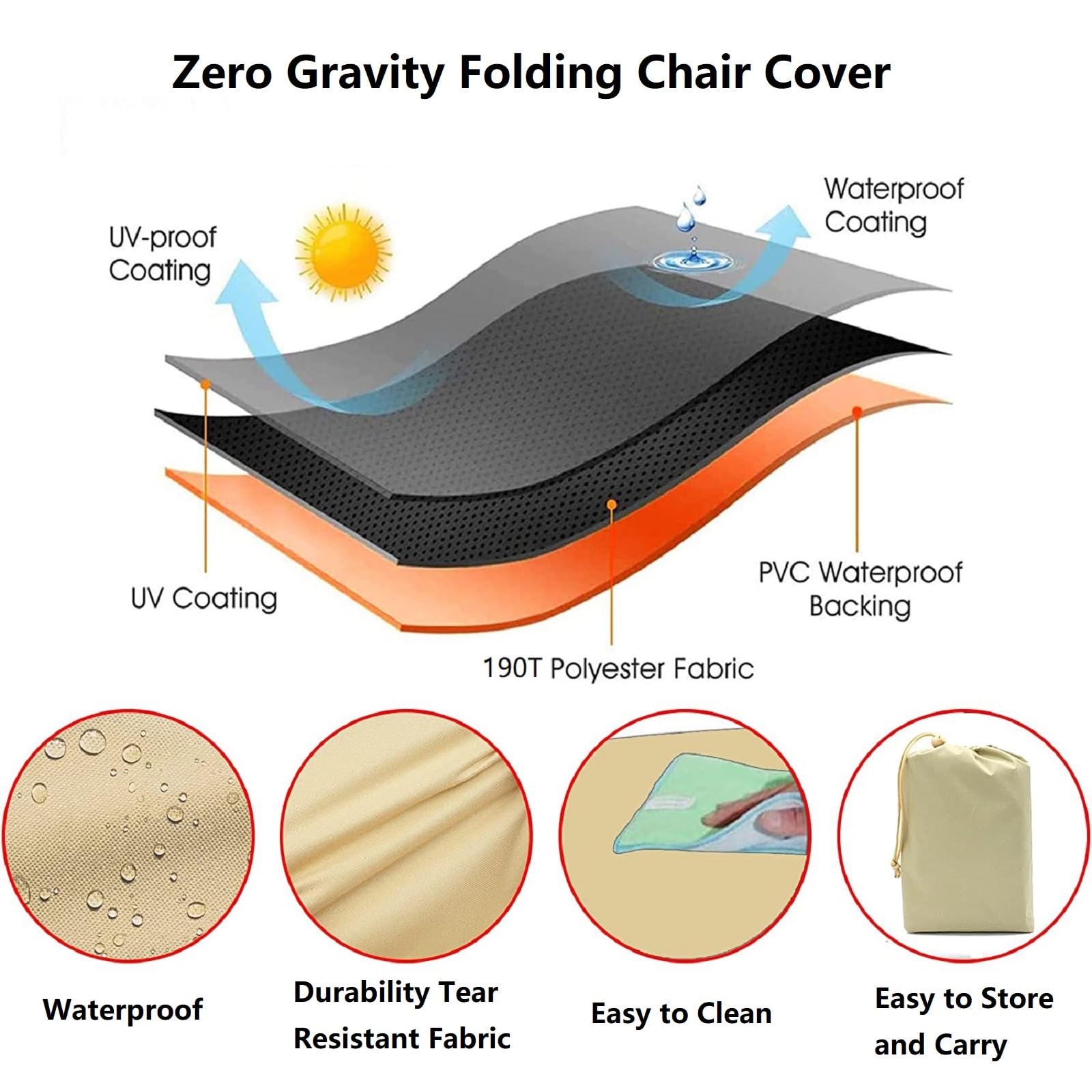 【Tear-proof and UV-resistant】The cover for zero gravity chair is made of durable 190T polyester fabric materal. Keeps your folding zero gravity chair dry and tear resistance, not easy to fade. The UV protection design provides excellent durability for sunlight. Added water repellent coating, so the water will not penetrate, and it can slide off quickly, keep a dry surface.