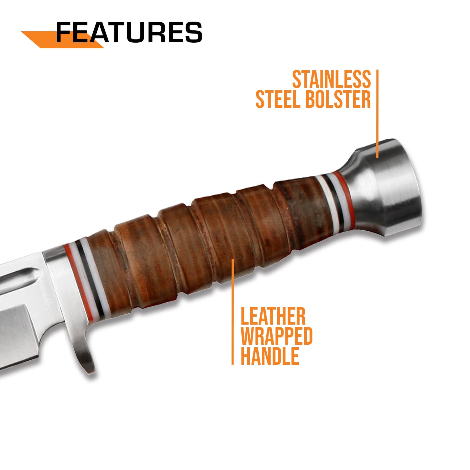 SPECIAL FEATURES: Fixed Blade Knife, Full Tang Construction, Leather Wrapped Handle with Silver Bolster and End Cap, Includes Leather Sheath.