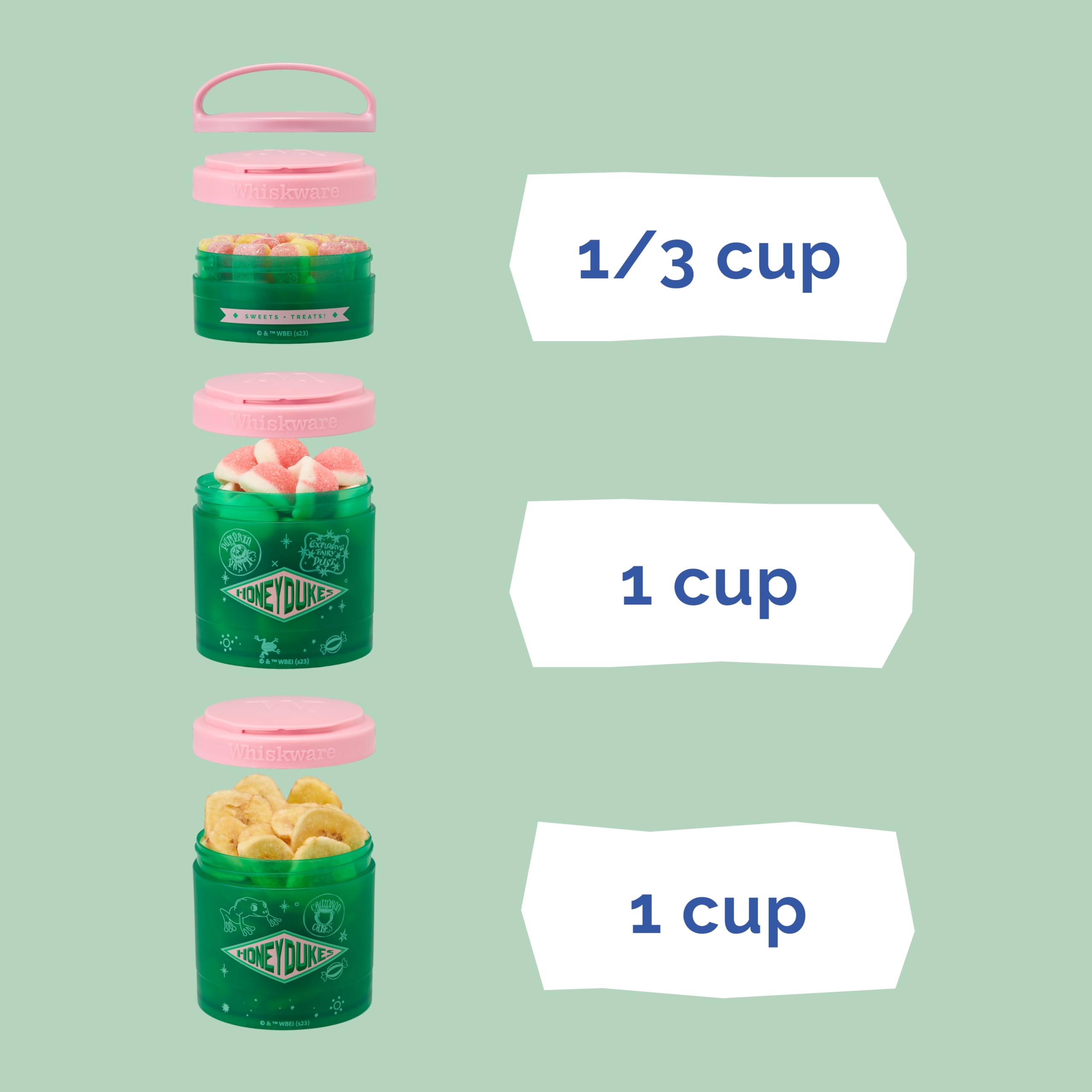 Includes 3, cupholder friendly jars, measuring 1/3 cup, 1 cup, and 1 cup