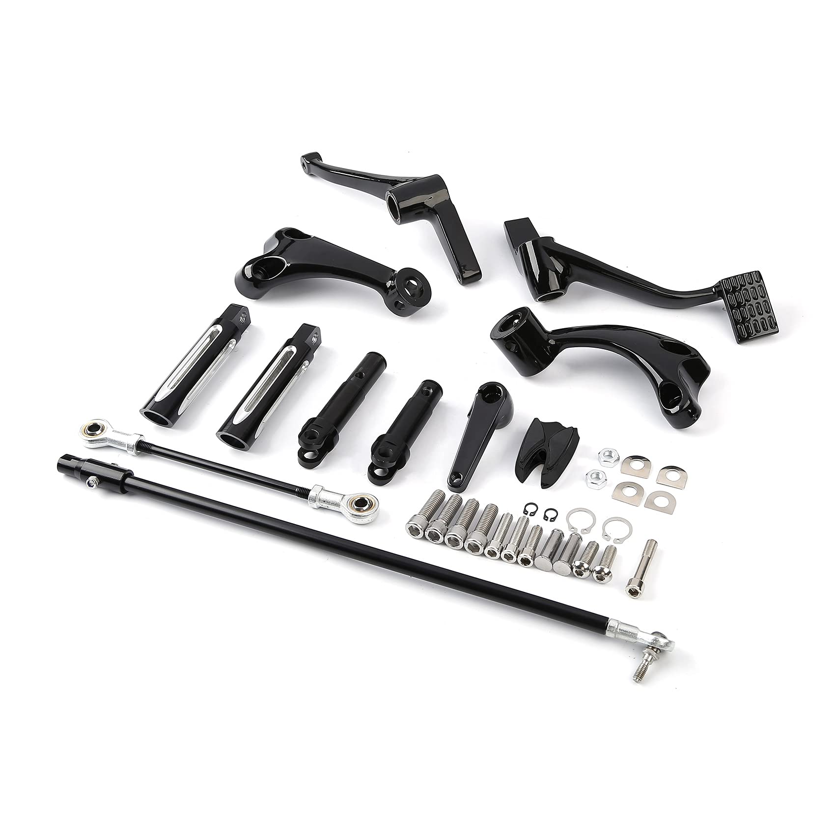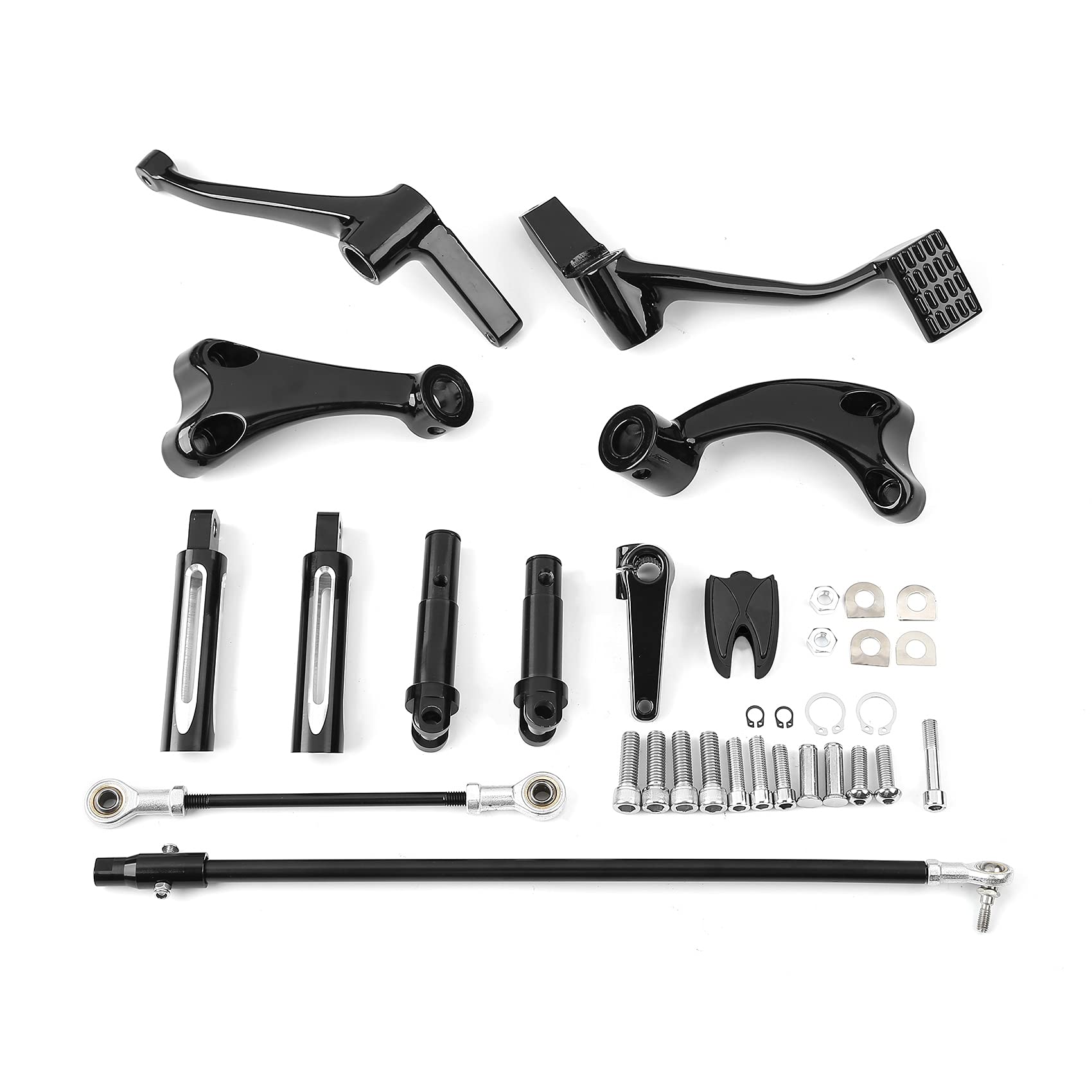 FITMENT: Fit for 14-later XL models. Requires separate purchase of stock or accessory rider position footpegs with wear pegs that fit for 14-later XL1200 models. Fit For Forty-Eight XL1200X 2014-2022 Fit For Iron 883 XL883N 2014-2022 Fit For Iron 1200 XL1200NS 2018-2022 Fit For Roadster XL1200CX 2016-2020 Fit For 1200 Custom XL1200C 2019 Fit For Sportster 1200 Custom XL1200C 2014-2018 Fit For Forty-Eight Special XL1200XS 2018-2019 Fit For SuperLow XL883L 2014-2019 Fit For SuperLow 1200T XL1200T 2014-2017 Fit For Seventy-Two XL1200V 2014-2016 FEATURES: Aftermarket 100% Brand New Complete assemblies for both brake and shifter sides. Kit includes pegs, levers, linkage and hardware Made from Aluminum + Steel + Rubber, Mounts easily to front motor mounts. You do not need to purchase anything else, just bolt them on. These controls will not work on cycles with an engine guard, 2-in-1 exhaust or crash bars PACKAGE INCLUDED: Complete Kit Pegs Levers Linkage.