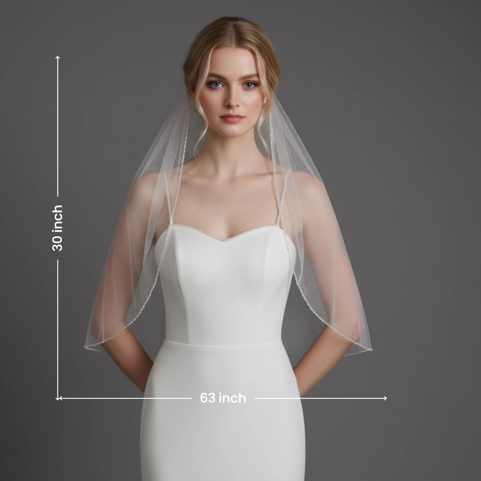 Length:30IN (Elbow ) 39IN (fingertip), 59IN (Waltz), 78 IN (chapel), 118IN (cathedral) fivespecifications, to meet the church ceremony, outdoor wedding and other diverse scene needs .