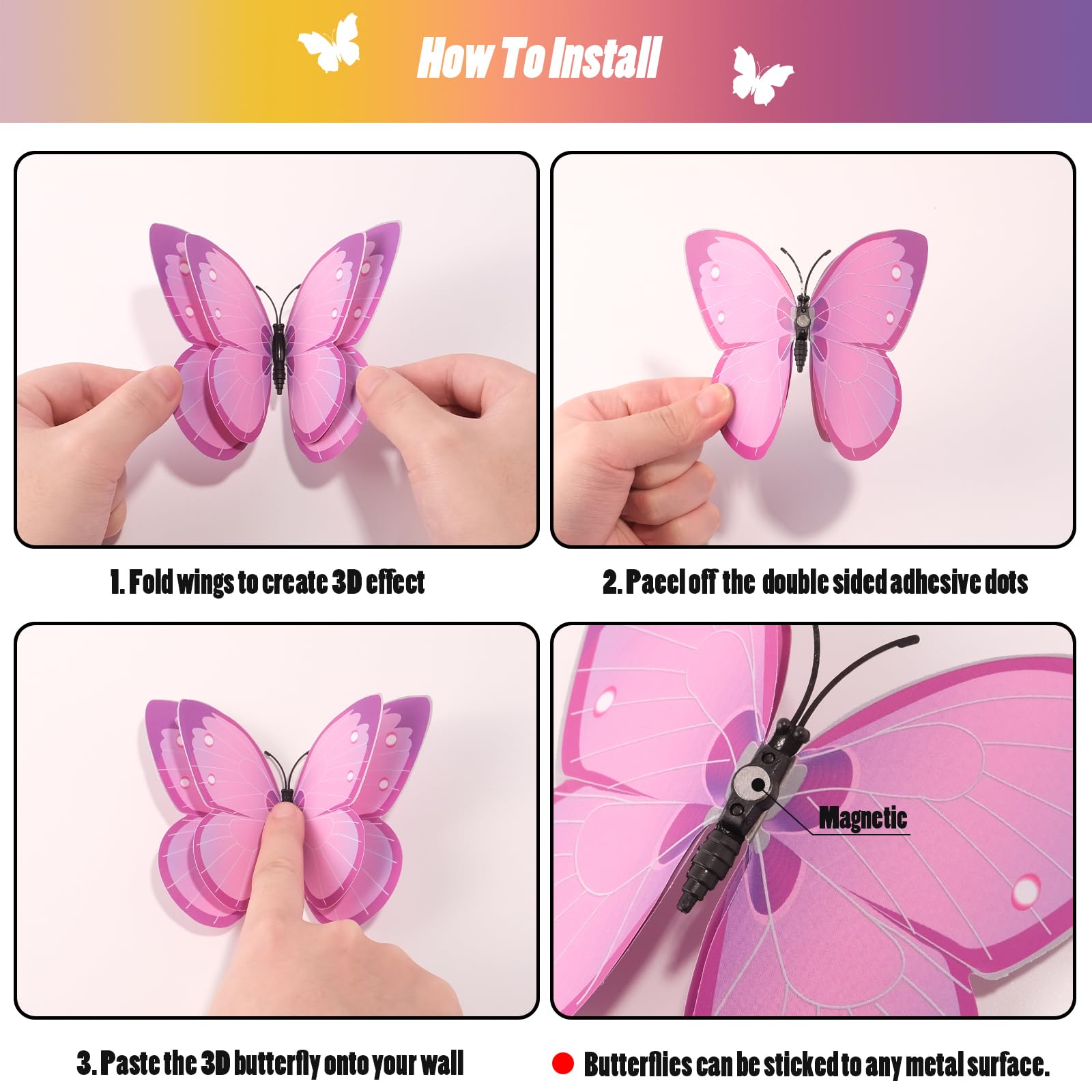 【Double Layer Butterfly】The upgraded double-layer design gives the butterfly a stronger 3D effect. Fold the wings to obtain a fluttering butterfly and apply on anywhere you want.
