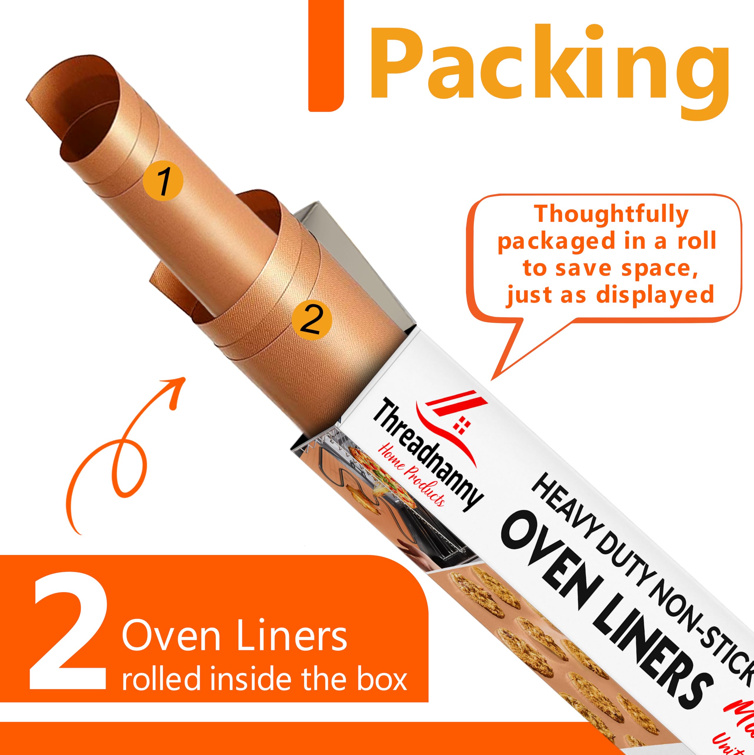 KEEP YOUR OVEN CLEAN: Save time and energy cleaning your oven thanks to ThreadNanny Non Stick Oven Liners. These heavy-duty oven mat for bottom of oven are the perfect solution to keep your oven mess and spill free. Gas oven liner catches cheeses, sauces and other baked-on messes that drips on the bottom of your oven.