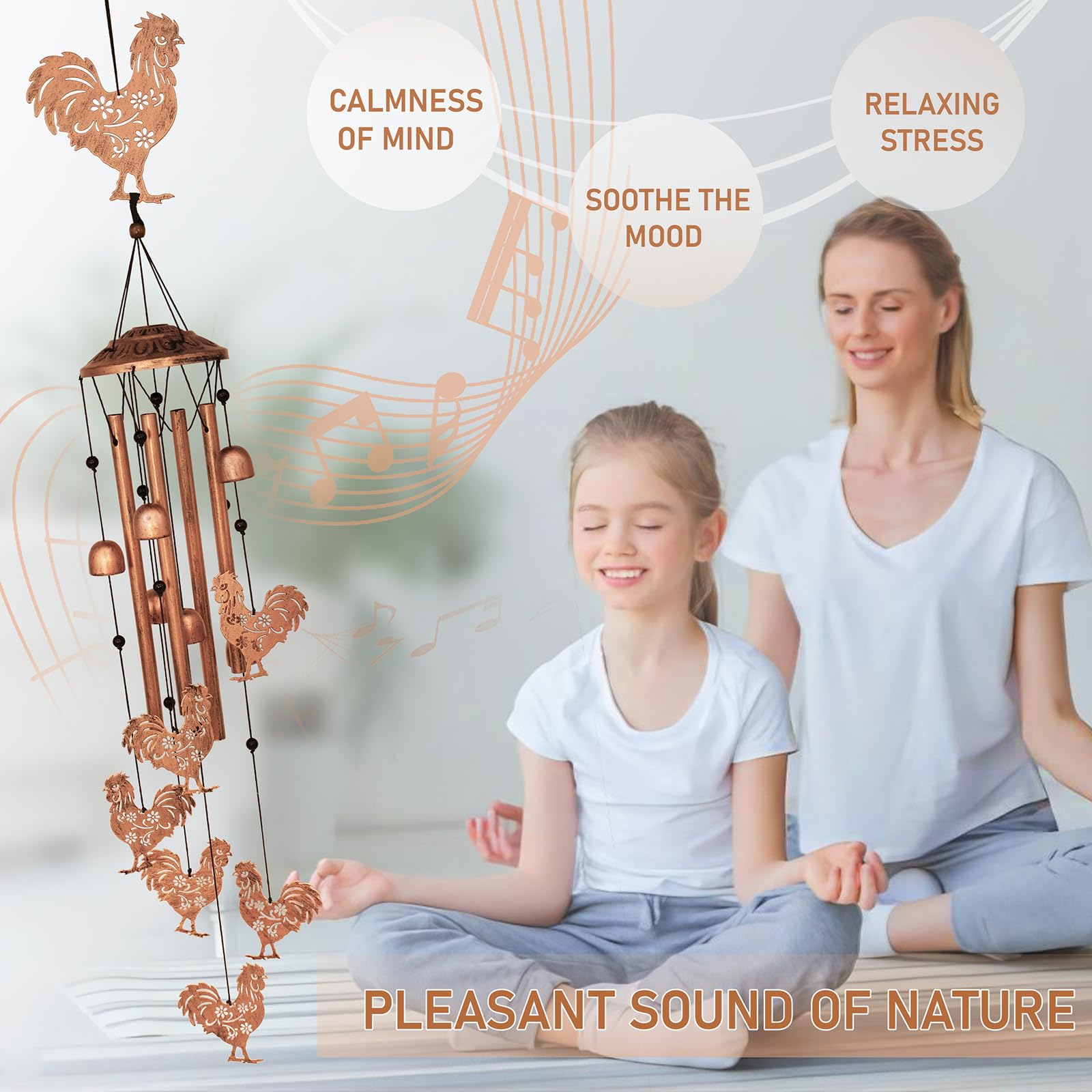 Nature's Melody: When the breeze blows over the chicken windchimes outdoors and pushes the aluminum tube to resonate, you will hear a deep tone. For you lying lazily in the yard, the breeze blowing the outdoor wind chimes is a kind of enjoyment, the atmosphere is mesmerizing, and it can relax your body and mind. It can be used in many places, such as a patio, bedroom, living room, balcony, garden, and so on.