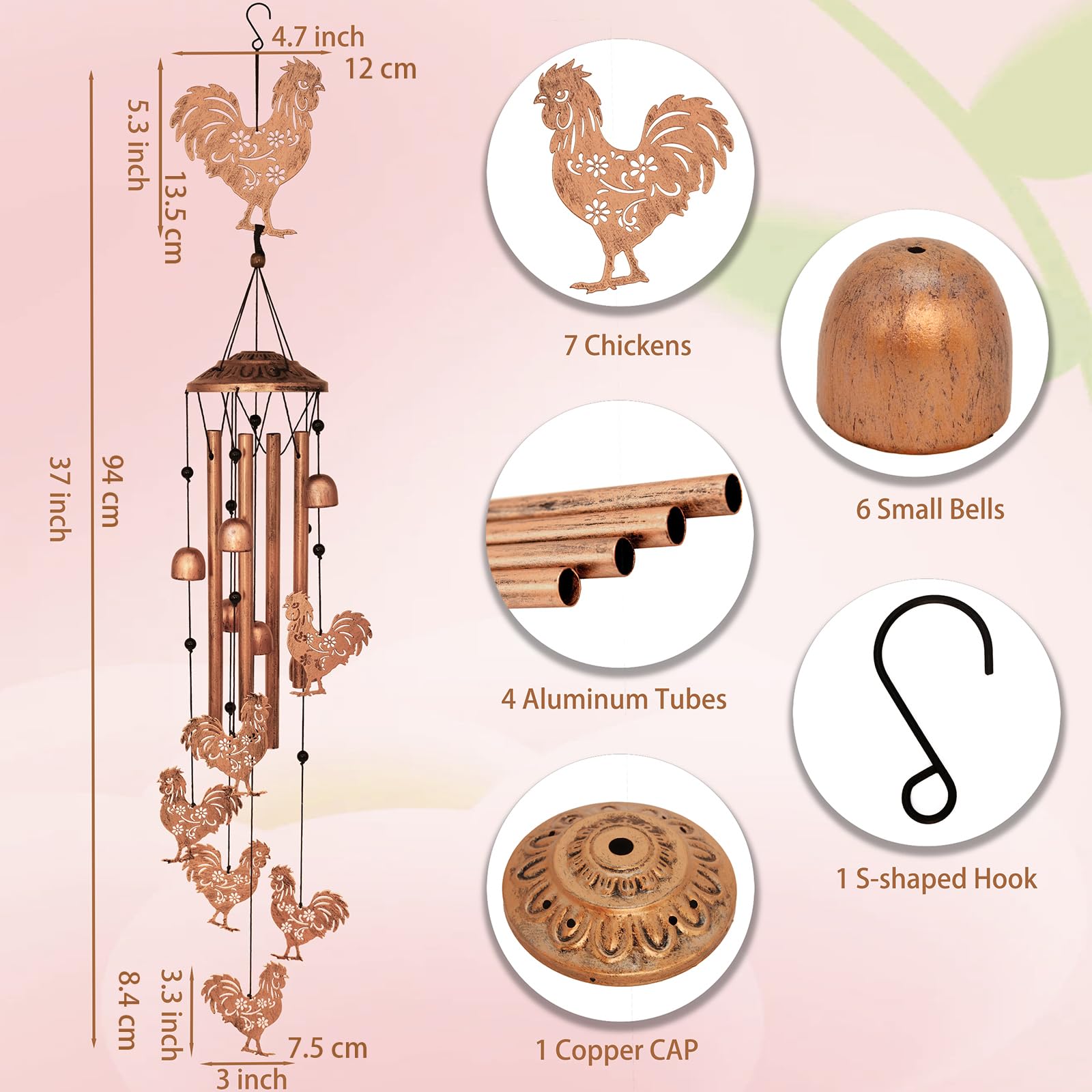 Unique Wind Chimes: Chicken wind chimes for outside are handmade by artists. The chicken garden decor for outside is made up of a big chicken, 6 small chickens, 4 aluminum tubes, 1 S-shaped hook, 6 bells, 1 finial, 13 beads, and black nylon rope to form a graceful wind chime. The elaborate design and vintage style give it a unique art that can be a focal point inside and outside the home.