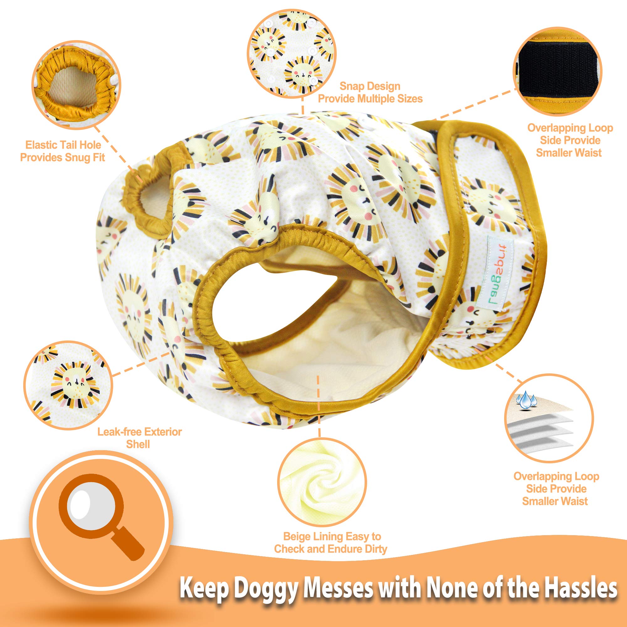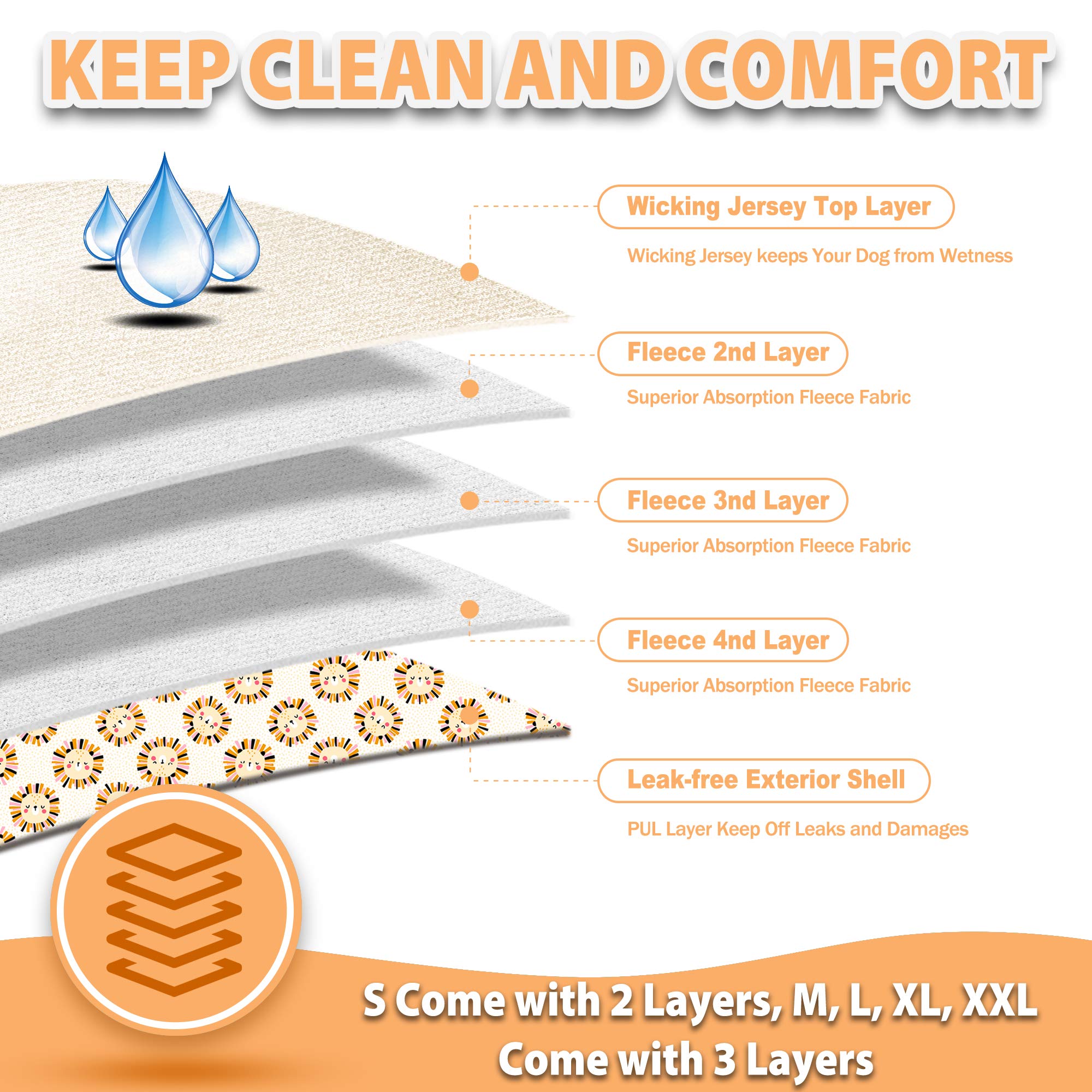 Absorbent & Leak-free Materials - The reusable female dog diaper inner layer is made of soft and breathable beige color wicking jersey, perfect to keep the dog from wetness. The 3 middle layers are made of highly absorbent fleece to absorb the liquid and stop any leaks.The diaper outer layer, with attractive and fun designs, is made of smooth and soft-to-touch leak-free TPU material to keep the floor or bed dry and clean.