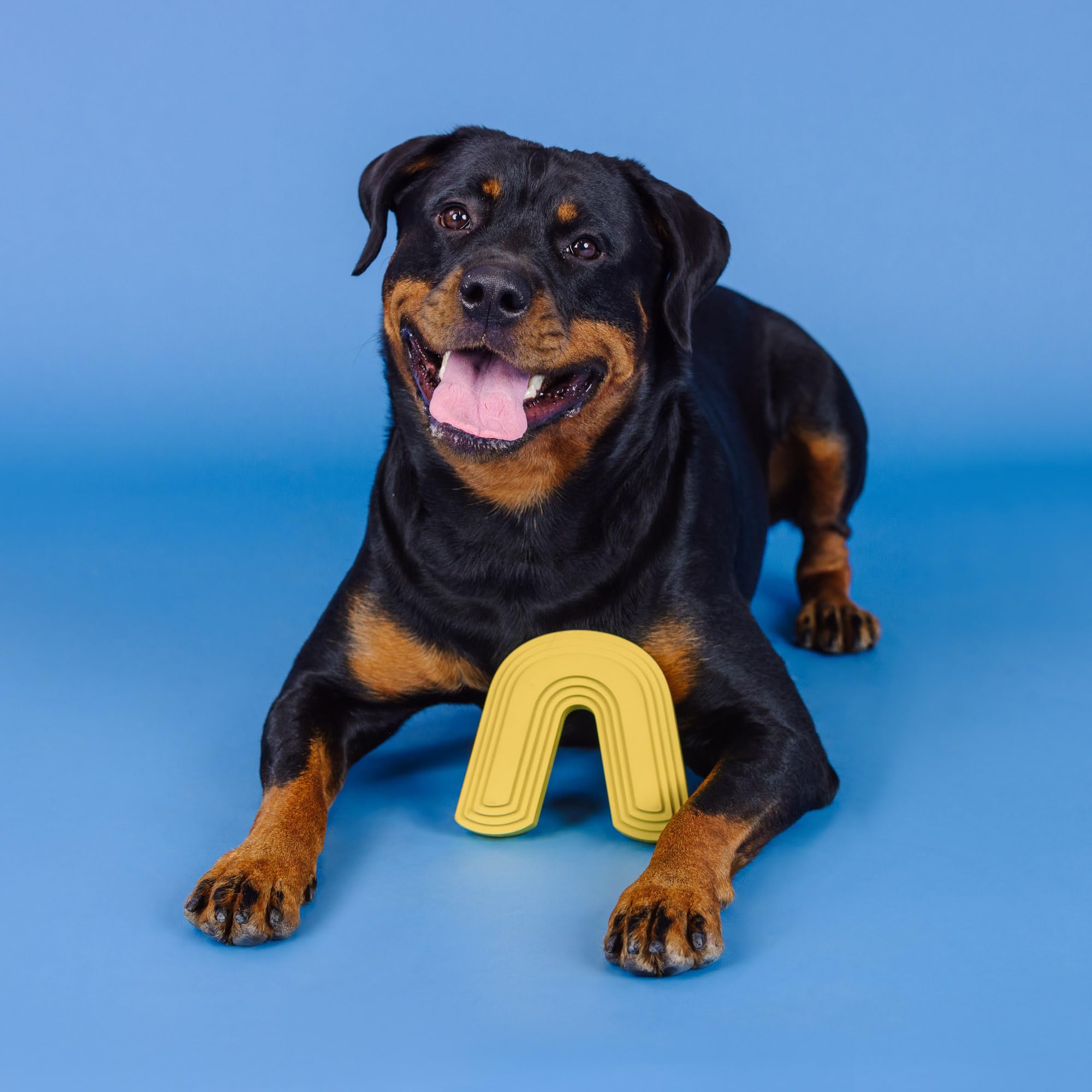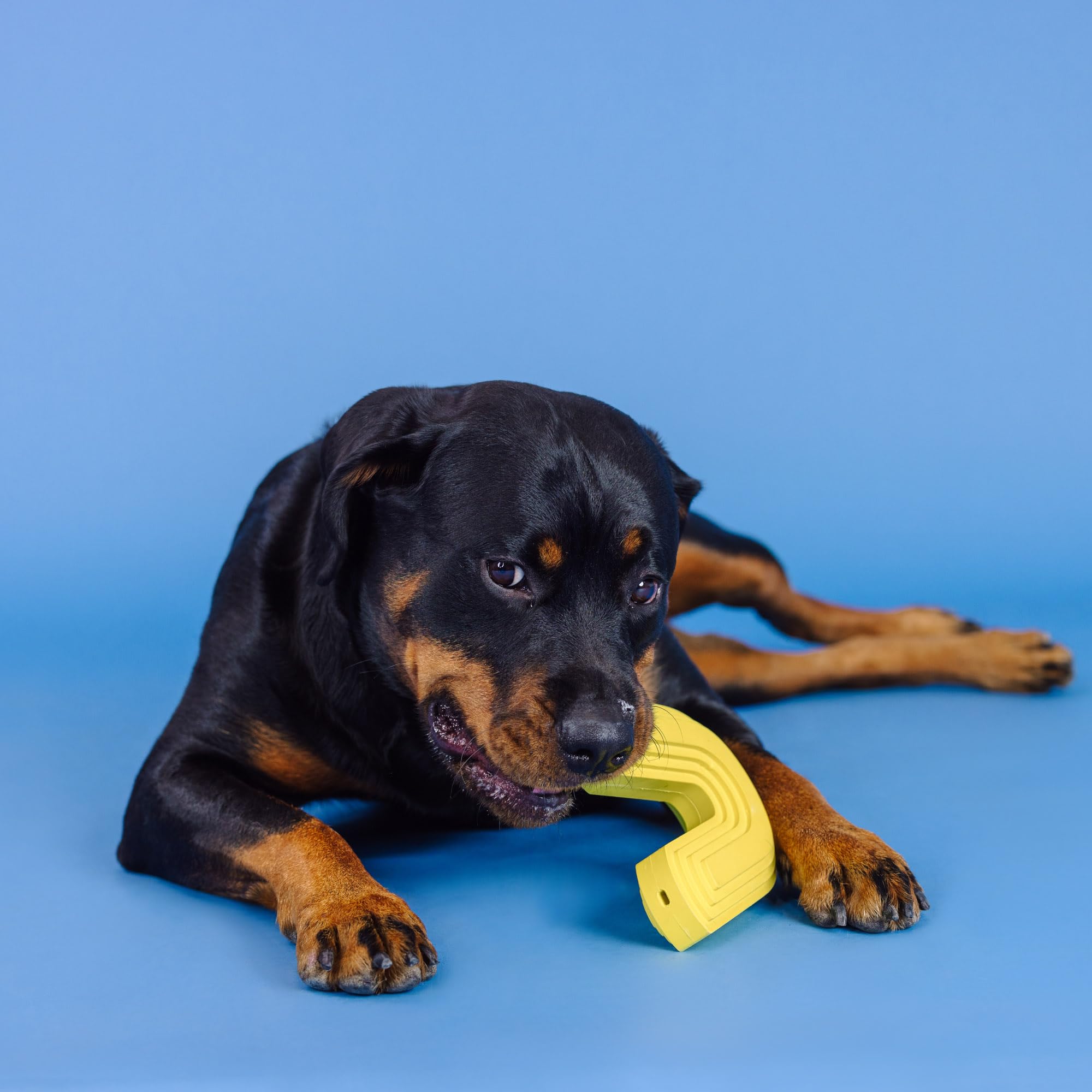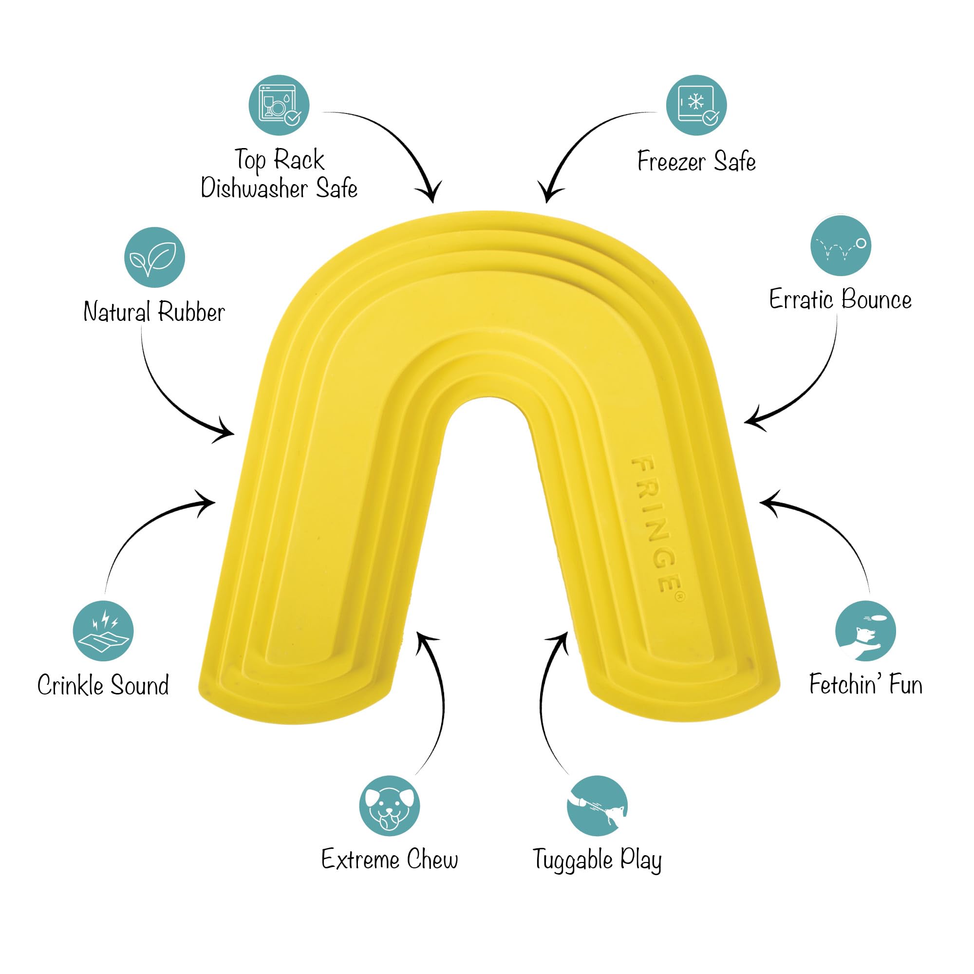 Ready to join the Dura Club? PetShop by Fringe Studio's "Color Me Happy" yellow rubber dog toy is for pups that love to chew, tug, and play lots of fetch. Made with natural extreme-chew rubber, an erratic bounce, and a crinkle sound, this toy was created for long-lasting interactive play. Simply toss it for some fetchin' fun or hold on tight to one end while your pup tugs the other end. Great for all-sized dogs and strong chewers.