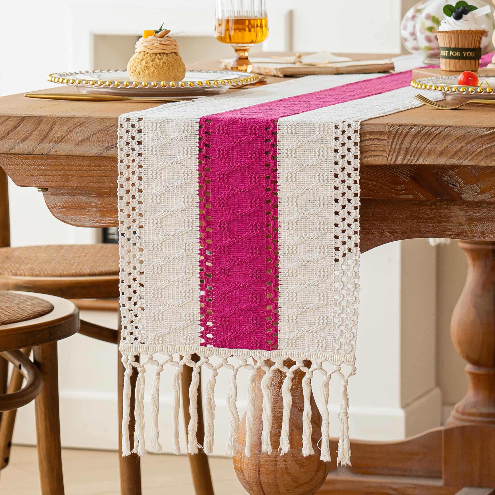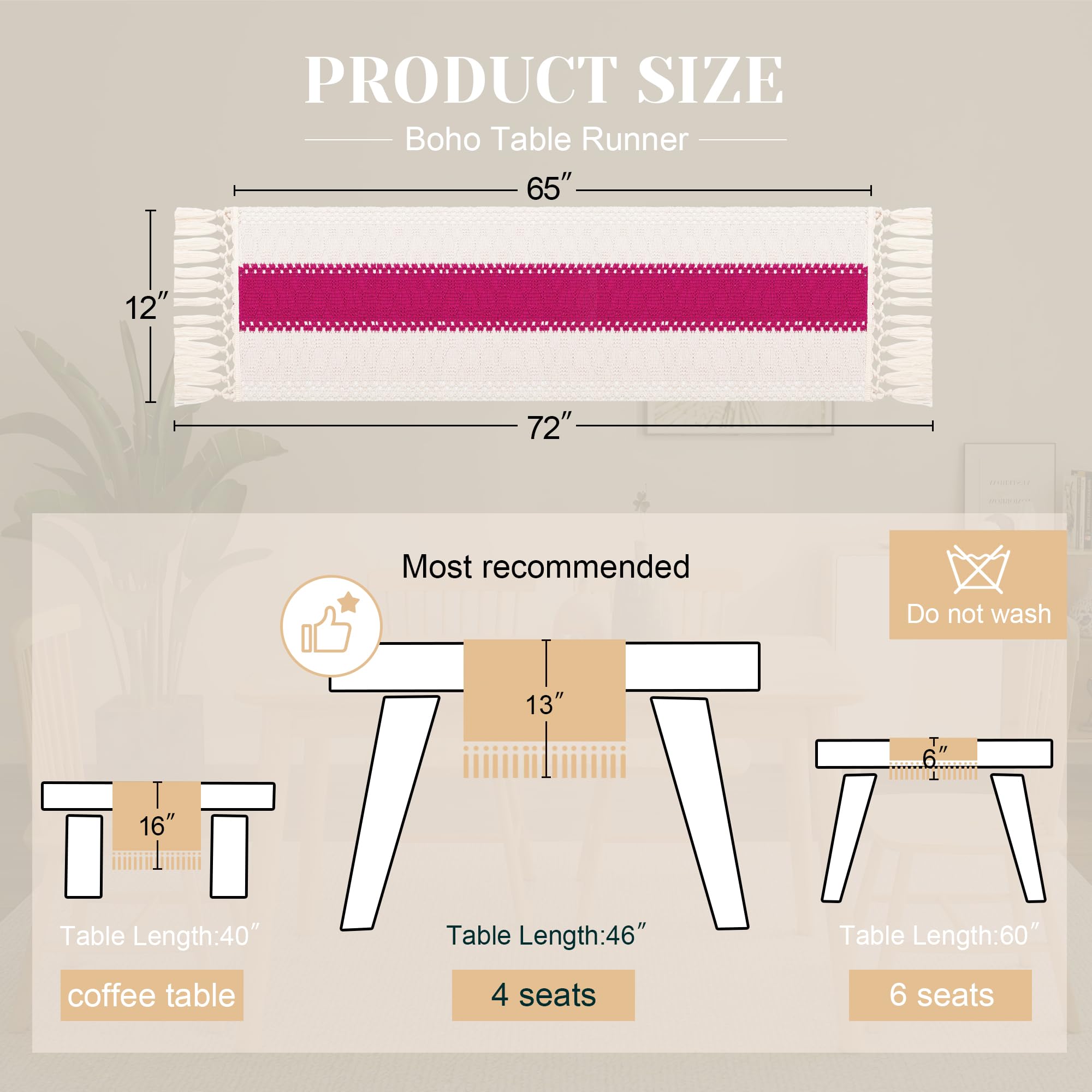 [Perfect 72 Inches Long]: Our macrame table runner with tassels measures 12 x 72inch, fits a dining table that seats 4-8 people. It can give your tables a rustic and boho look. (Because it is folded in the bag, when you take it out, the table runner will have creases, which will affect your measurement. So, please make sure the table runner is placed neatly and flat before measuring.)
