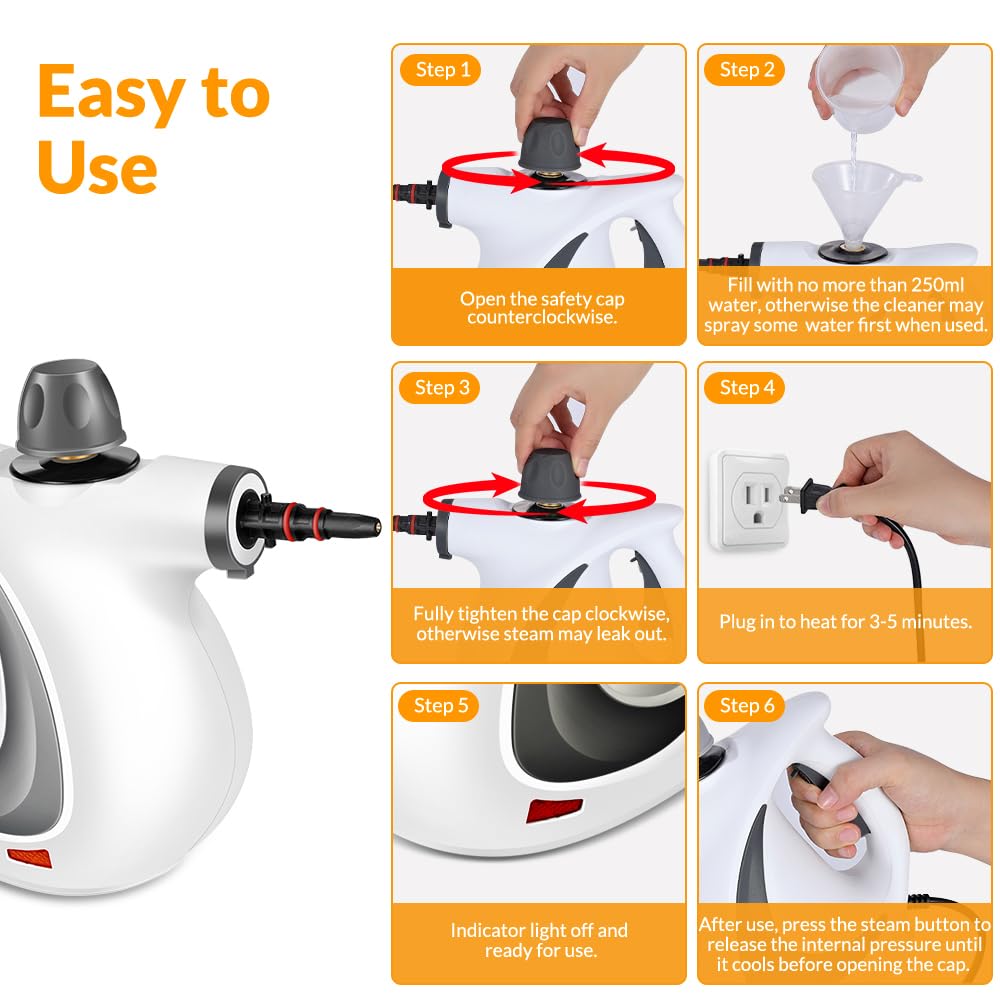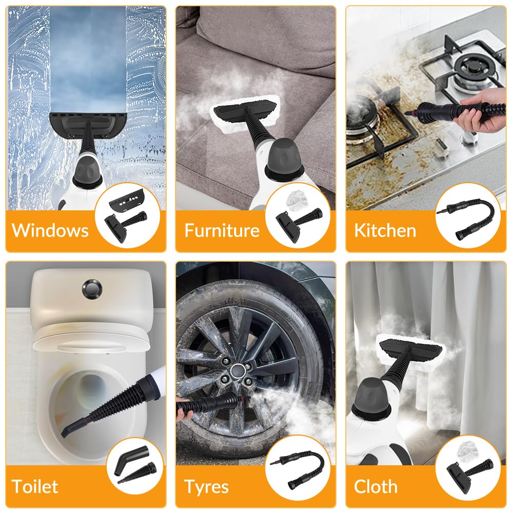Multifunctional Steam Cleaner: Our handheld steam cleaner is a versatile and fully equipped cleaning tool, you can use this steamer to clean floor, tile, grout, fabric and sofa material, windows, car, furniture, upholstery, sink, gap, wall, kitchen, bath and more