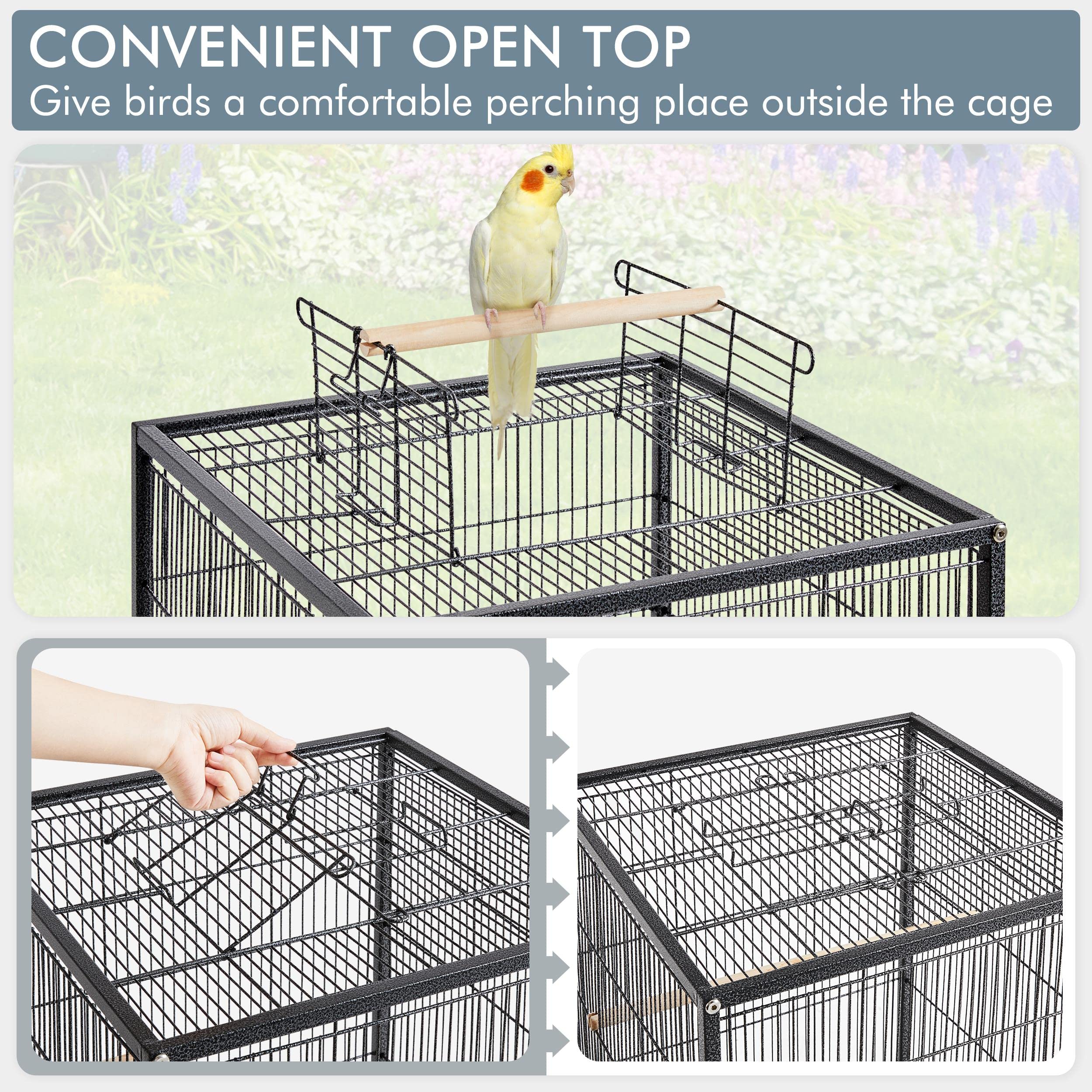 Open-Top Design For Better Stimulation: The open-top design with a dowel perch of this metal parrot cage offers a more convenient way for you to interact with petite feathered friends and keep them stimulated outside the cage