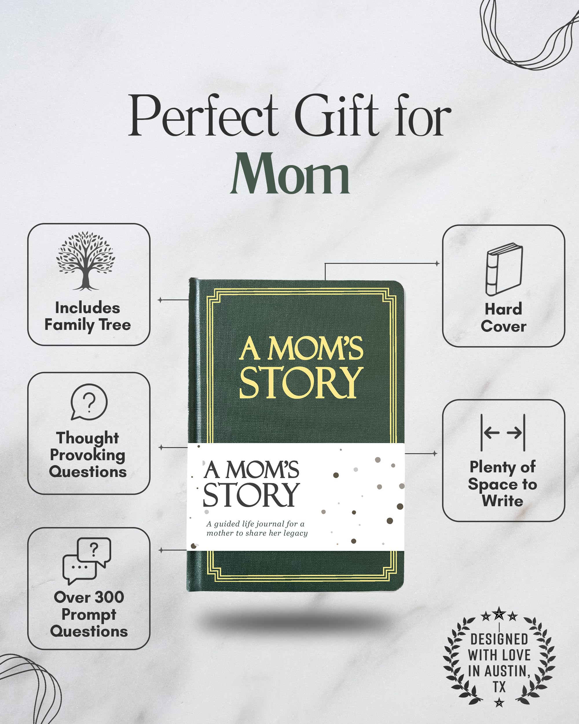 Our guided legacy journal with prompts is a perfect gift idea for a mom. There are more than 250 fun questions to fill out, and these questions are carefully designed to help a mom share her memories and tell her life story in her own way.