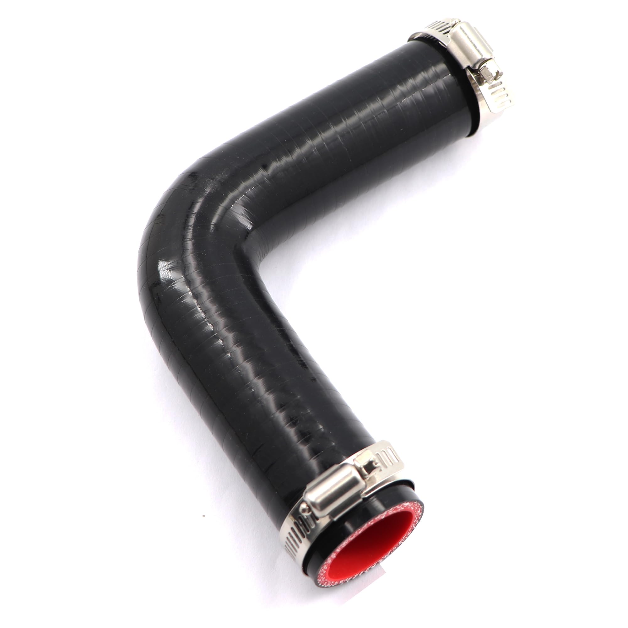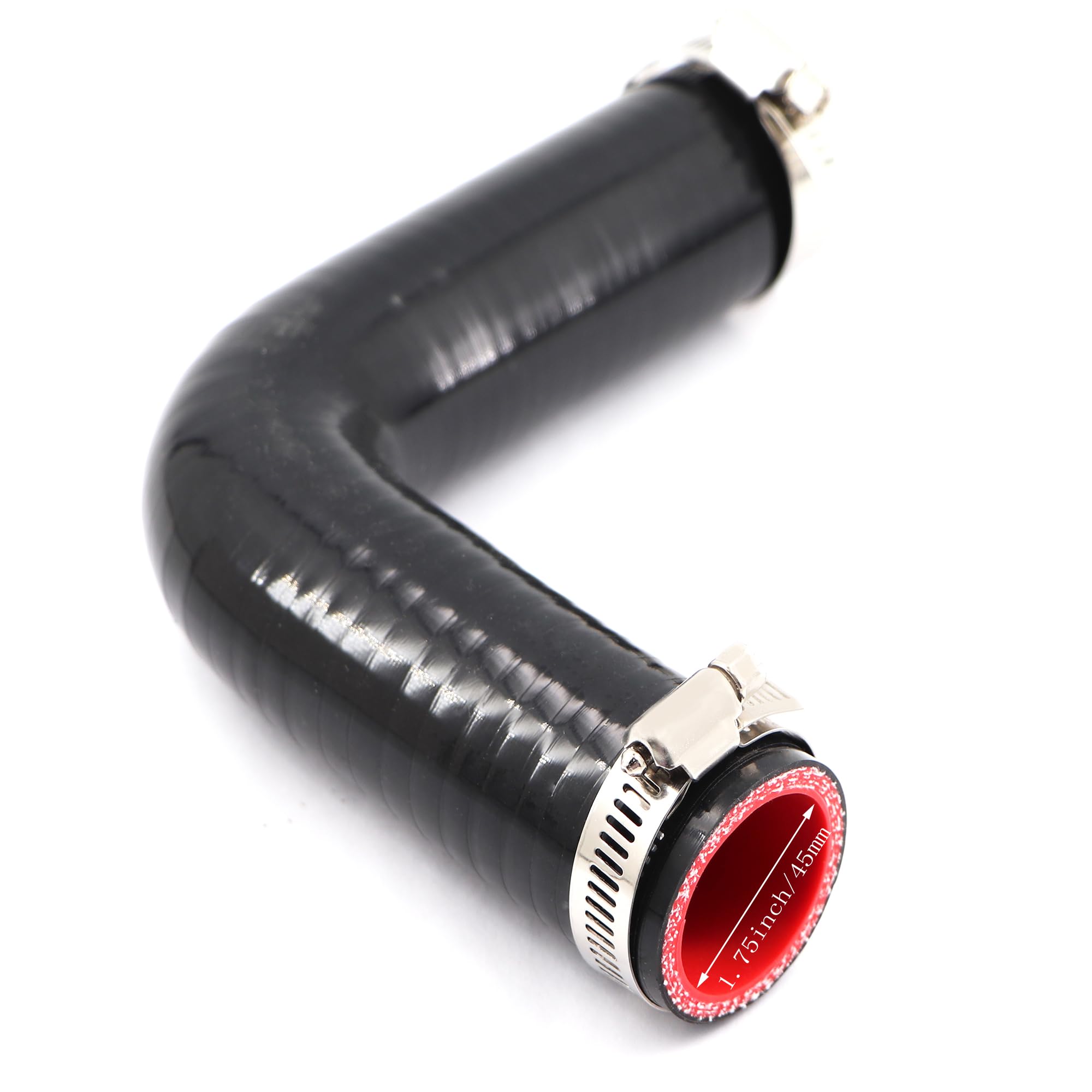 Size: 90 Degree silicone elbow size is 1.75 inch (45mm). Leg Length: 4 inch (102mm). Wall Thickness: 0.2 inch (5mm),adjust the angle cut to fit and replace stock elbow.