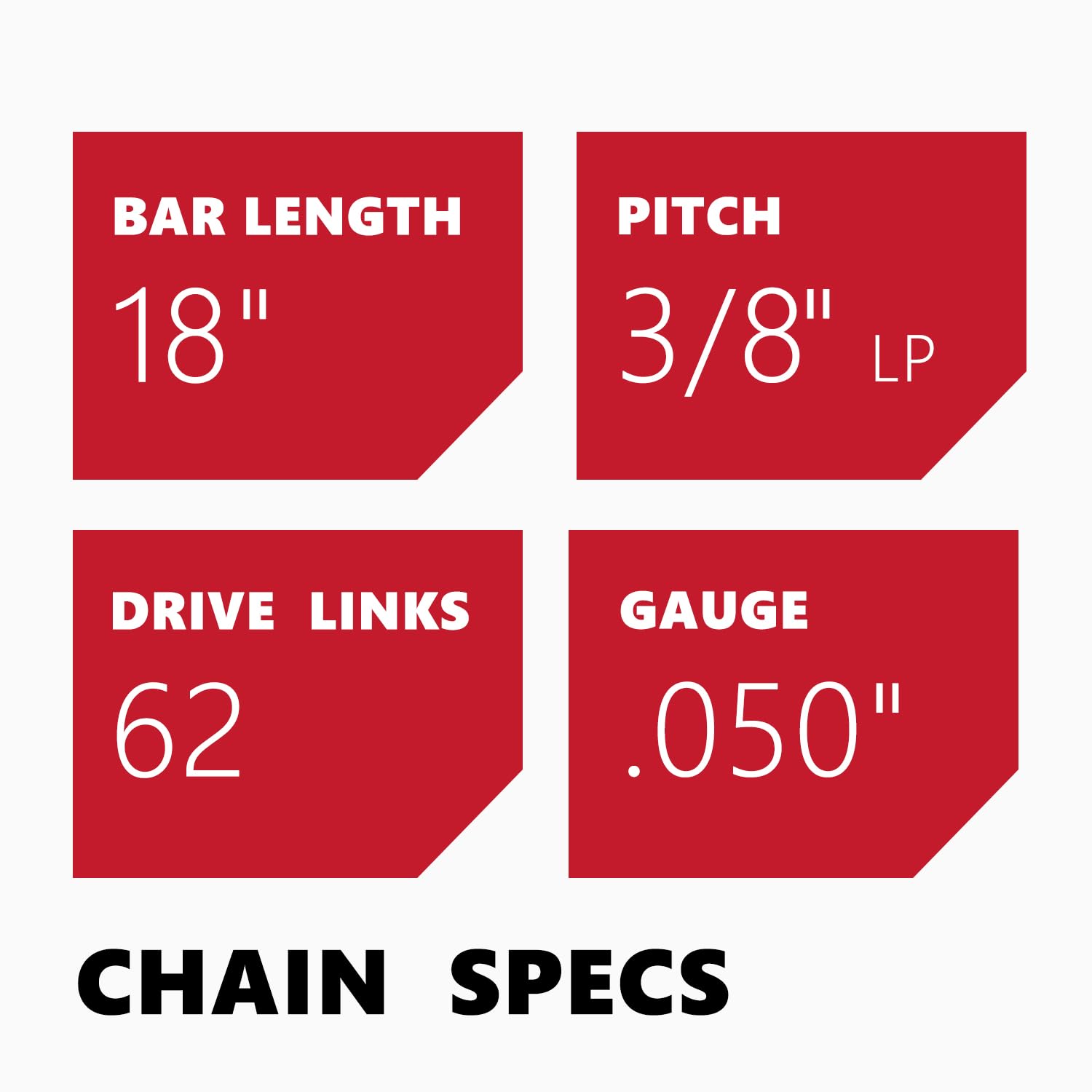 【SPECIFICATIONS】 3 Pack 18 Inch, 3/8" LP Pitch, .050" Gauge, 62 Drive Links, semi-chisel. This saw chain met the kickback performance requirements of ANSl B175.1-2012 when tested according to the provisions of ANSl B175.1-2012. Low kickback saw chain meets the kickback performance requirements of CSA Standard Z62.3.