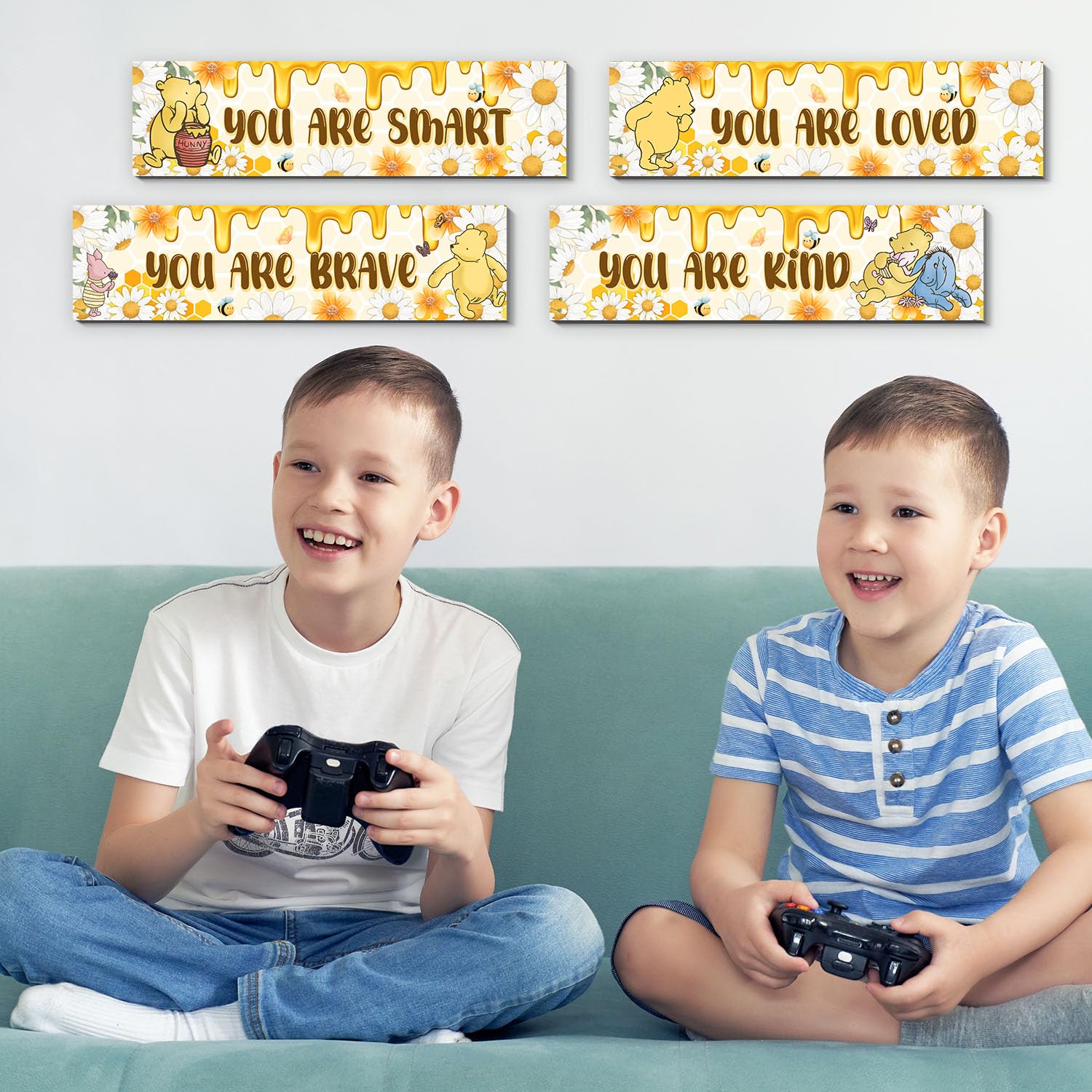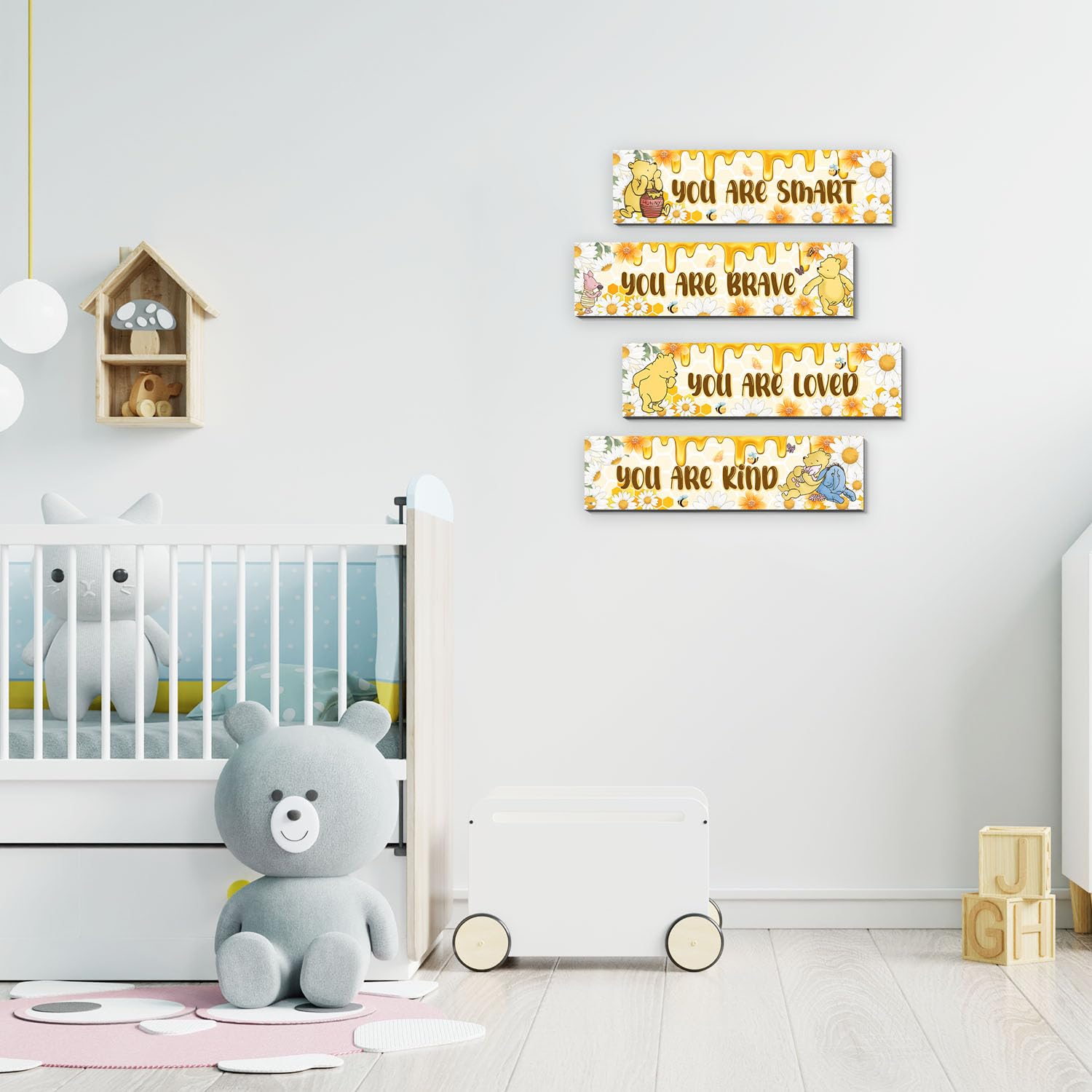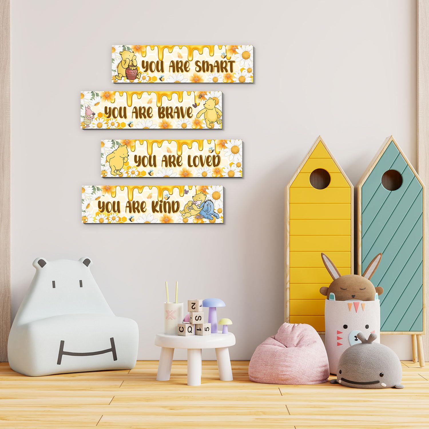 4 Piece Set for Comprehensive Decor: this package includes 4 winnie theme sign, each featuring a design; The set allows for various decorating possibilities, either as individual pieces or a collective display, providing a full, comprehensive decoration experience; The equipped hooks at the back make the installation easy, transforming the children's room into their Spider universe in just a few minutes