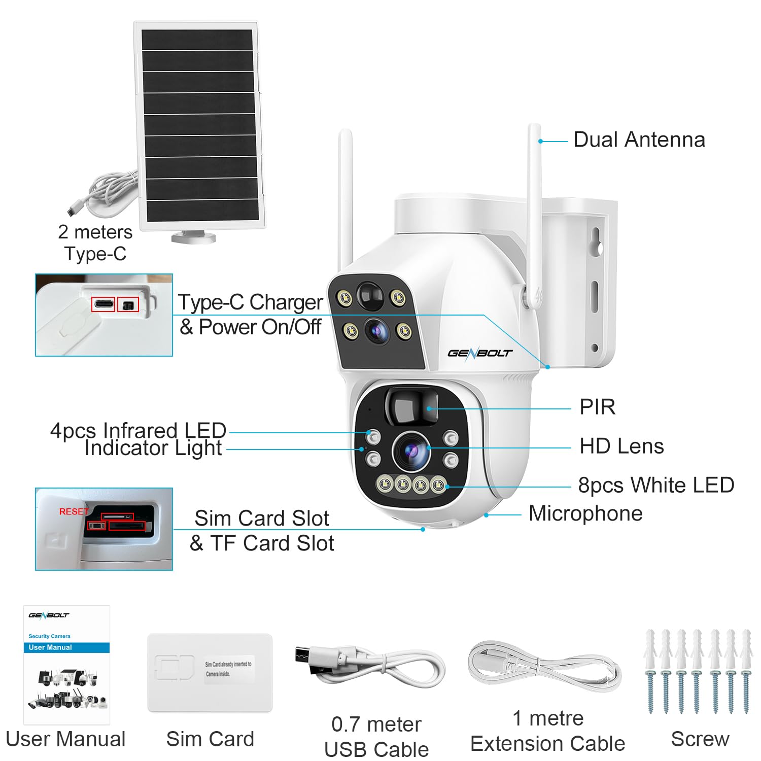 π[Preferd GENBOLT 4G SIM Card] LTE sim camera can refill and check 4G data at any time in APP, don't worry about no data. GENBOLT Surveillance dedicated data, high speed, real time, no frame drop. Powerful 4G basebank chip+intelligent algorithm to save data of surveillance camera. GENBOLT 4G SIM card has been paired with APN, no need to setup.300mb free data for 4g wireless camera outdoor, 30 days trial
