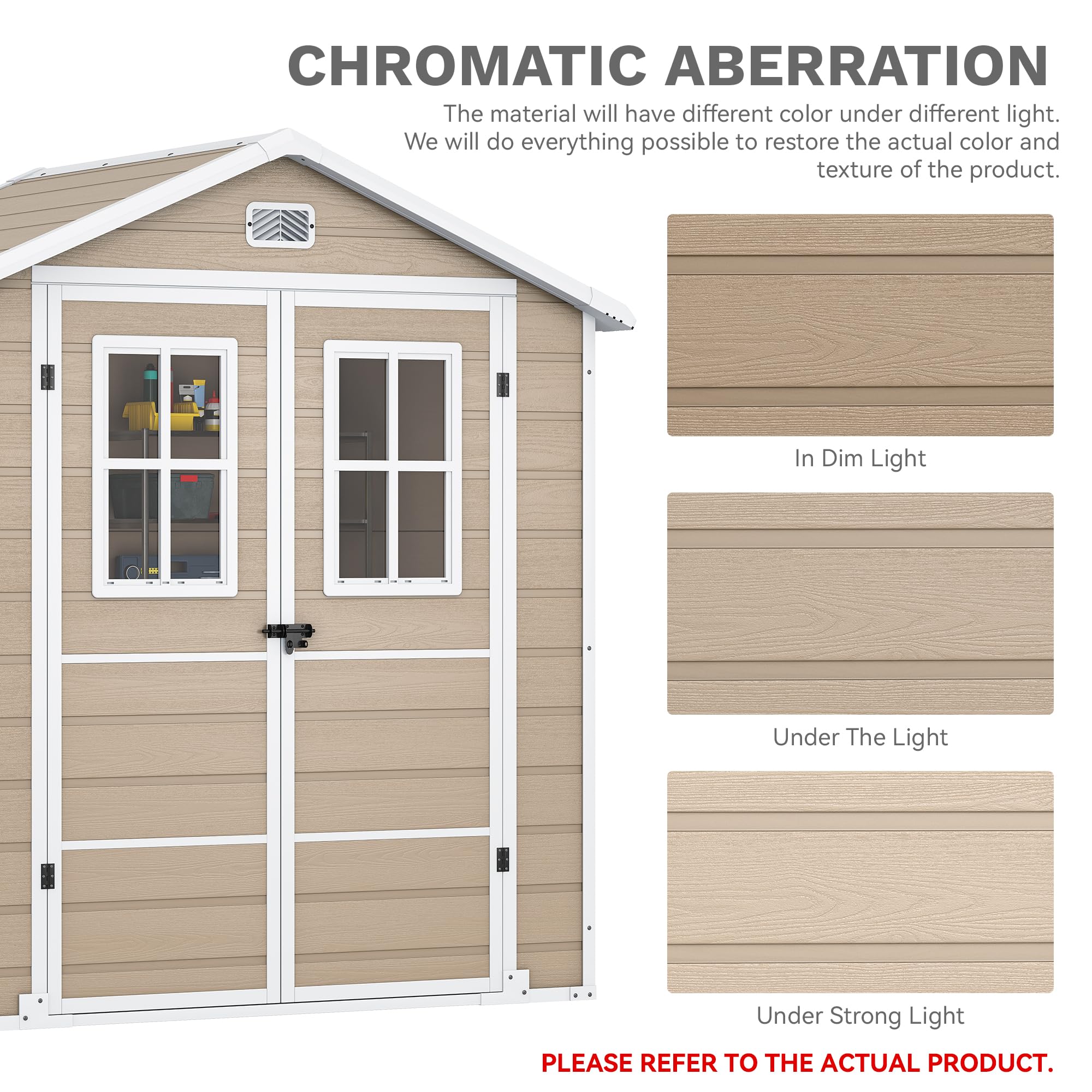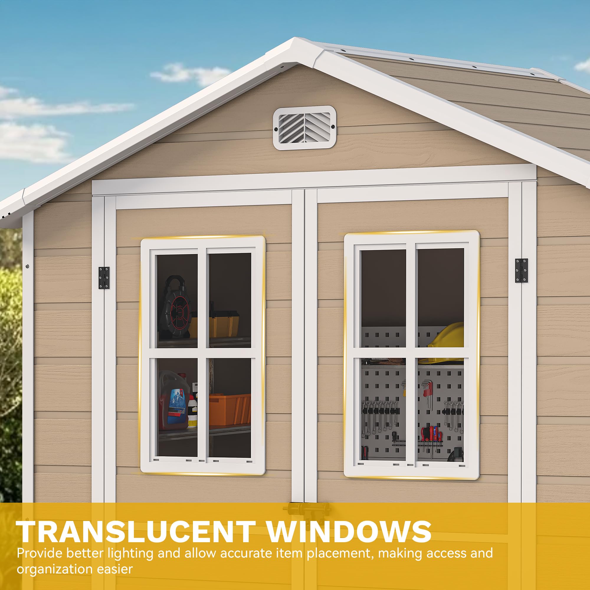 Fresh Air & Light Inside: Two windows (Single' size: 15.16" W × 25.20" H) & ventilation holes prevent stuffiness while letting sunlight in. The garden tool shed's sloped roof sheds rain and snow, and the lockable door keeps everything secure. Your storage stays good and well-lit